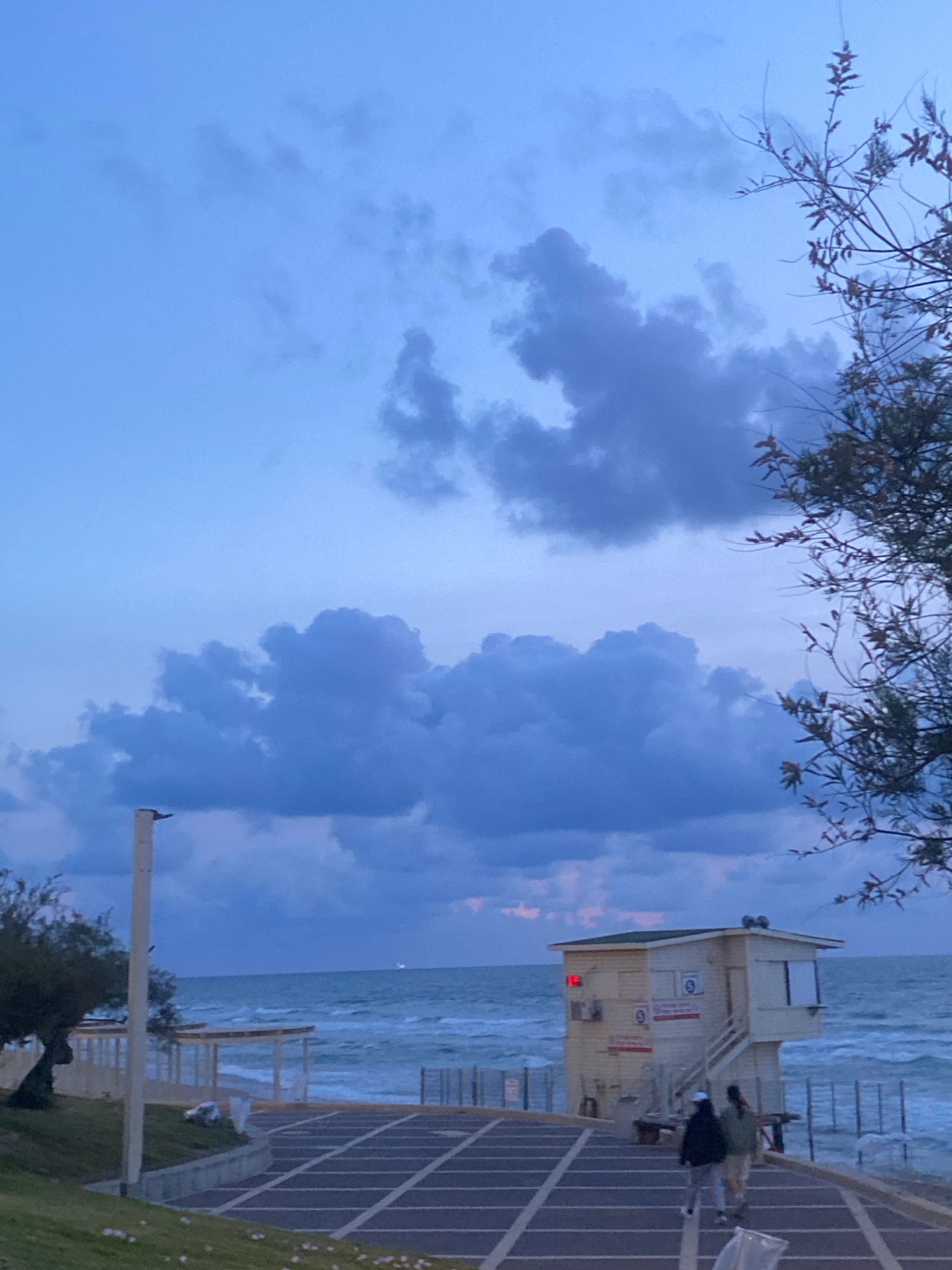 The image depicts a seaside scene, likely taken in Haifa, Israel. The sky is overcast with heavy, dark clouds, suggesting an approaching storm or the aftermath of one. A lifeguard station is visible n…read more