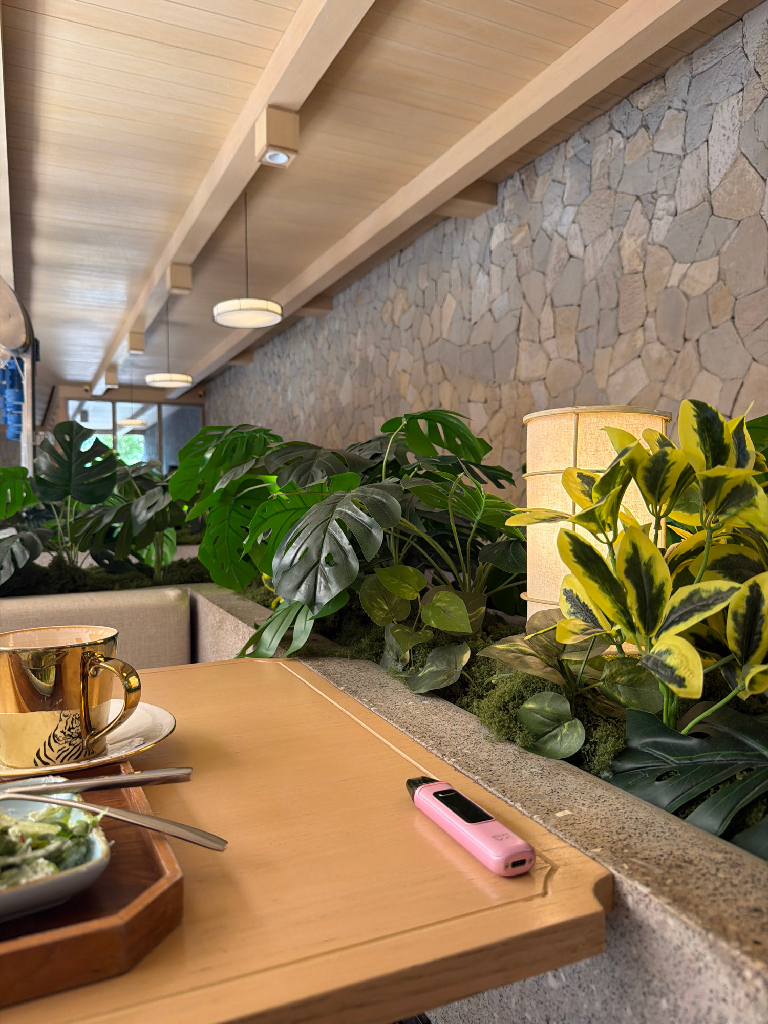The image depicts the interior of a restaurant or cafe in North Kuta, Indonesia, featuring a modern design with natural elements. The ceiling has a textured, stone-like appearance. A wooden structure…read more