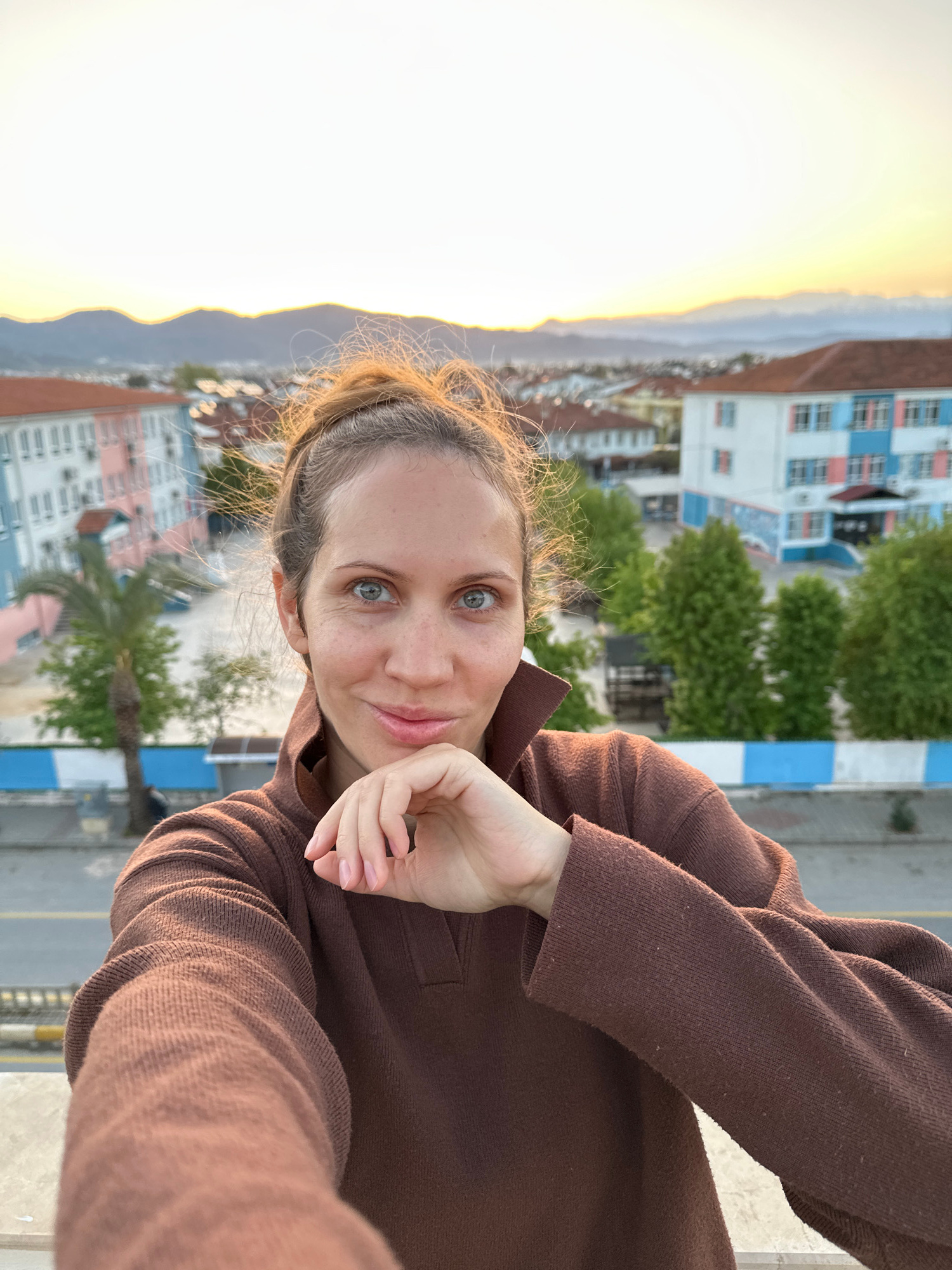 A woman with fair skin and light brown hair pulled back in a bun takes a selfie in Fethiye, Turkey. She wears a brown, long-sleeved sweater and gazes at the camera. Her left hand is raised near her fa…read more