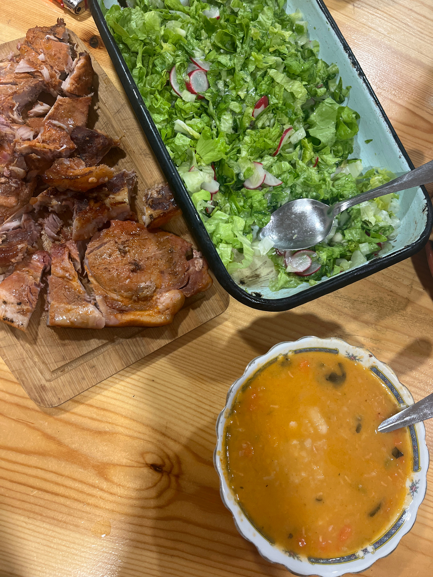 The image shows a wooden table with a meal laid out. On the upper left is a light blue rectangular enamel tray filled with chopped green lettuce and sliced radishes, with a metal spoon inside. To the…read more
