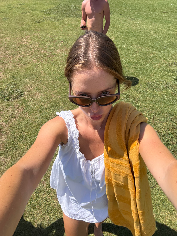 A woman with brown hair and sunglasses takes a selfie outdoors, lying on a grassy lawn. She wears a white ruffled top and has a yellow towel draped over her shoulder. A partially visible person stands…read more