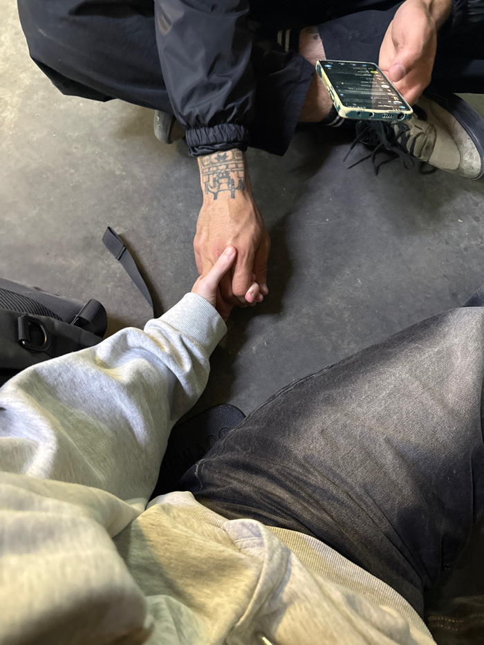 The scene depicts two individuals seated on a dark grey, uniform floor in the city of Ramat Gan, Israel. The upper person, identifiable by black athletic pants and a black long-sleeved jacket, holds a…read more