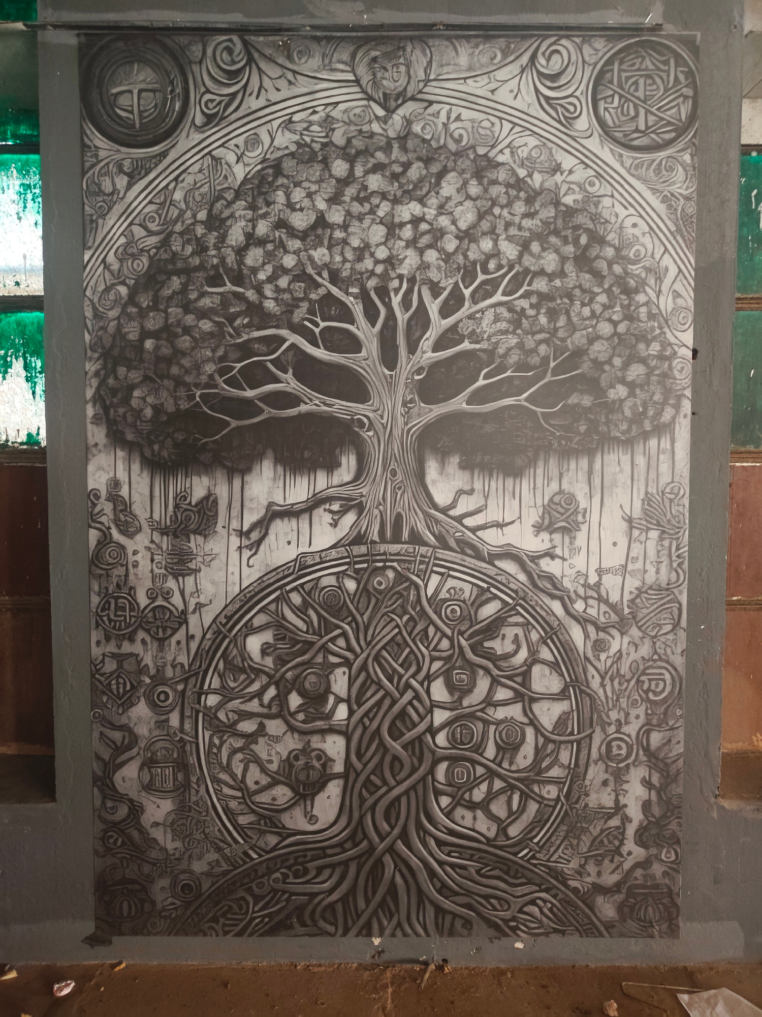 The image shows a large, detailed charcoal drawing of a tree, possibly the Tree of Life, affixed to a wall. The tree has a broad canopy of textured leaves and exposed roots which form a circular patte…read more
