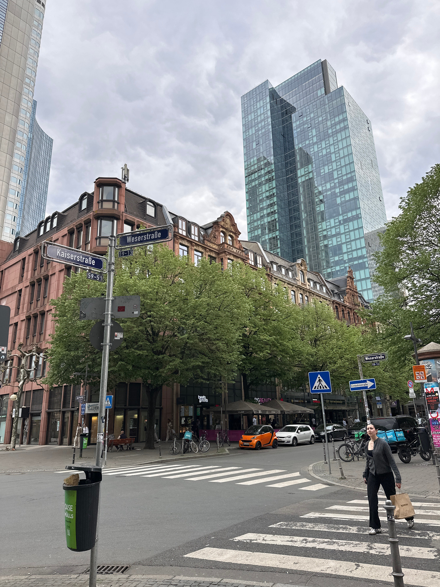 This media file captures a vibrant urban intersection in Frankfurt, Germany, oriented from a slightly elevated perspective overlooking the street. The scene is dominated by a striking contrast of arch…read more