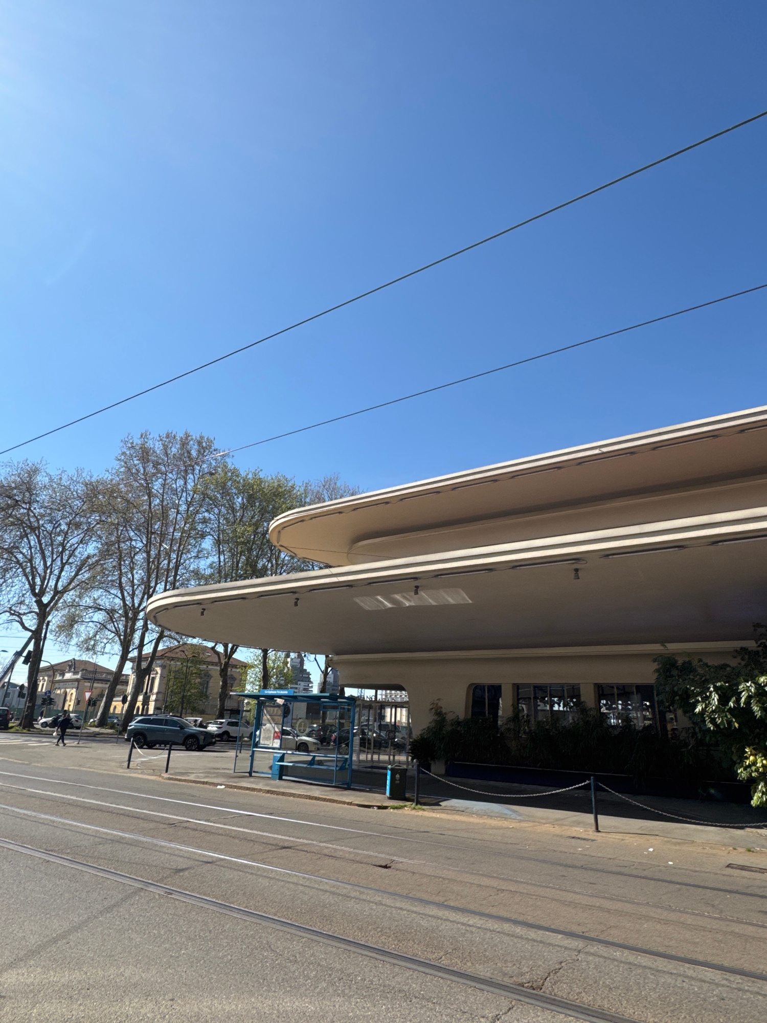 The image shows a street in Milan, Italy, featuring a tram line, a wide pavement, and a modern architectural structure overhead. The sky is clear and blue. There are overhead electrical lines. Trees l…read more