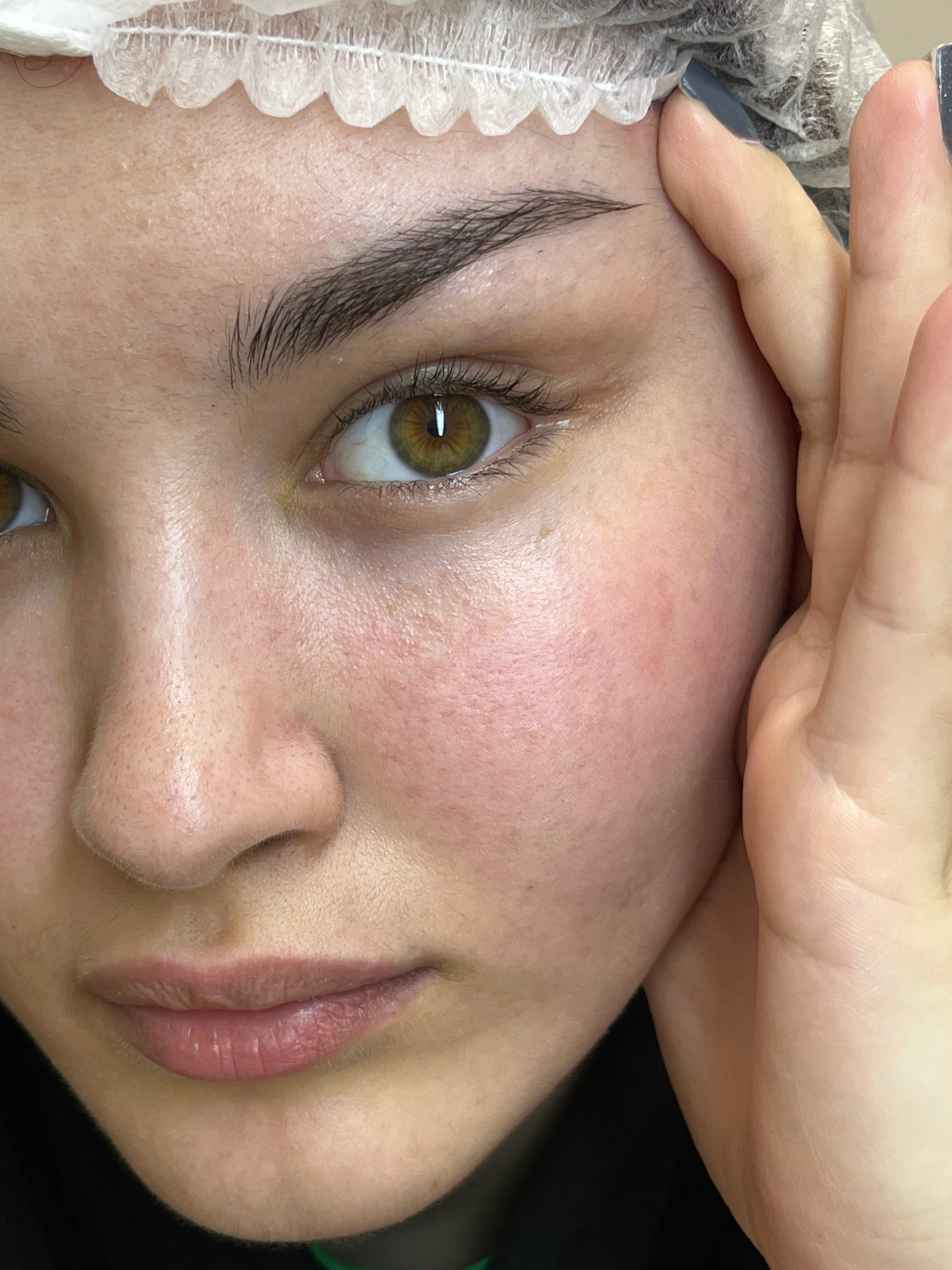 A close-up, angled shot shows the face of a person, likely female, with a hand partially obscuring the forehead. The person has brown eyes, dark eyebrows, and fair skin. The texture of the skin is vis…read more