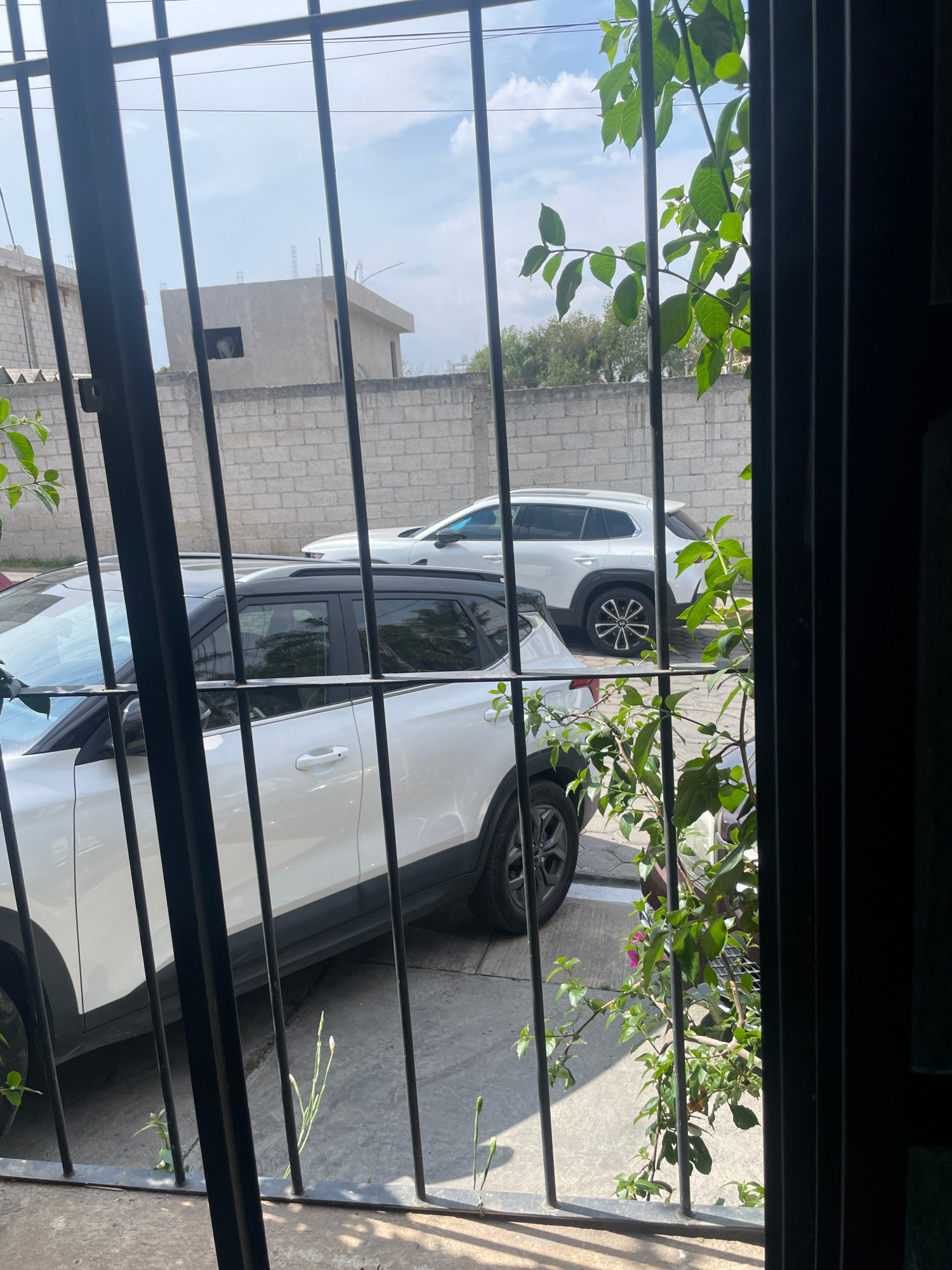 The image, taken from inside a building looking outwards through a barred window, shows a view of a residential or commercial area. Outside, two white cars are parked on a paved surface that appears t…read more