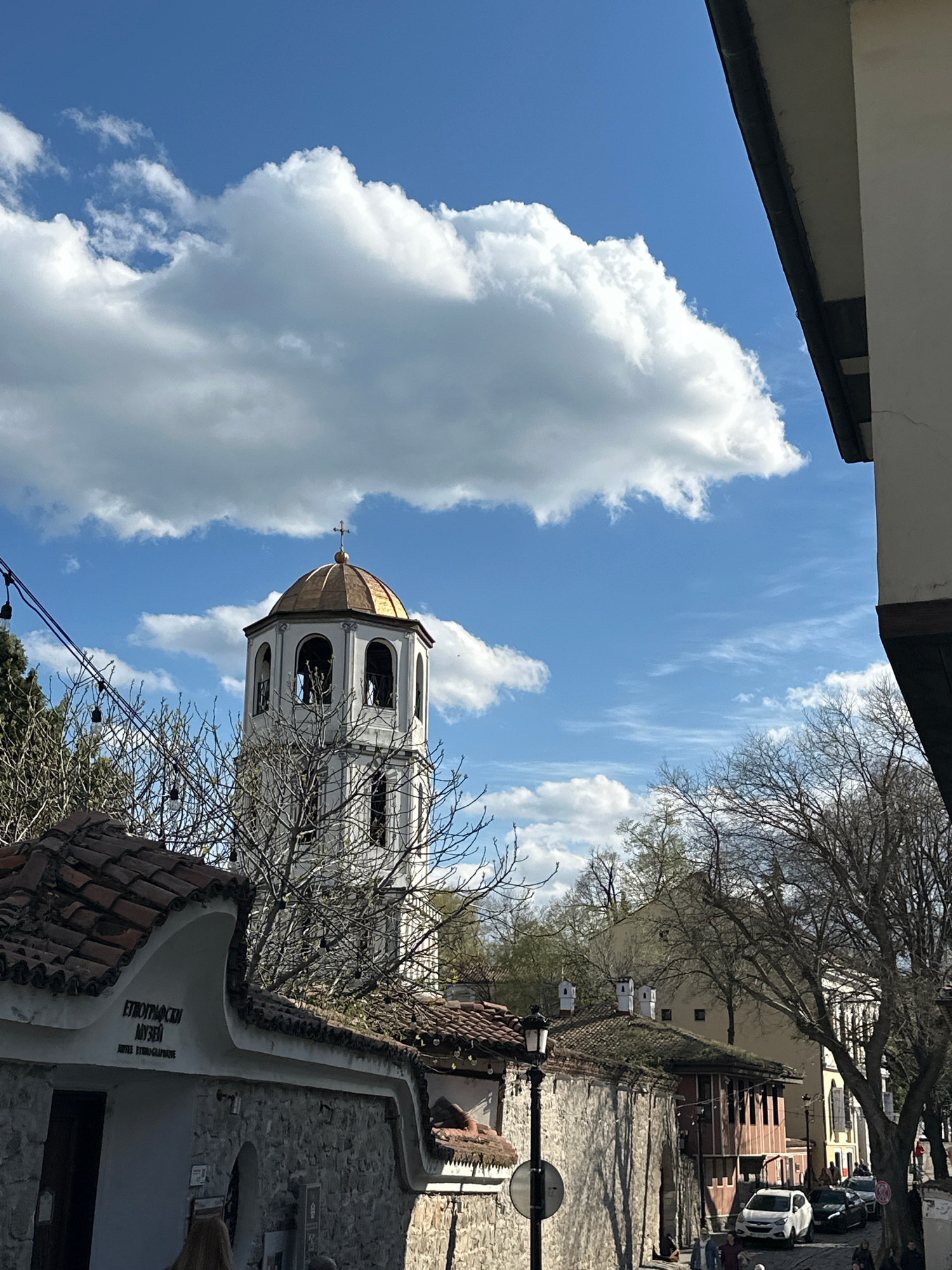 The image captures a low-angle view of the Ethnographic Museum in Plovdiv, Bulgaria, prominently featuring the museum's distinctive bell tower. The tower, painted white with a golden dome and a crossβ¦read more