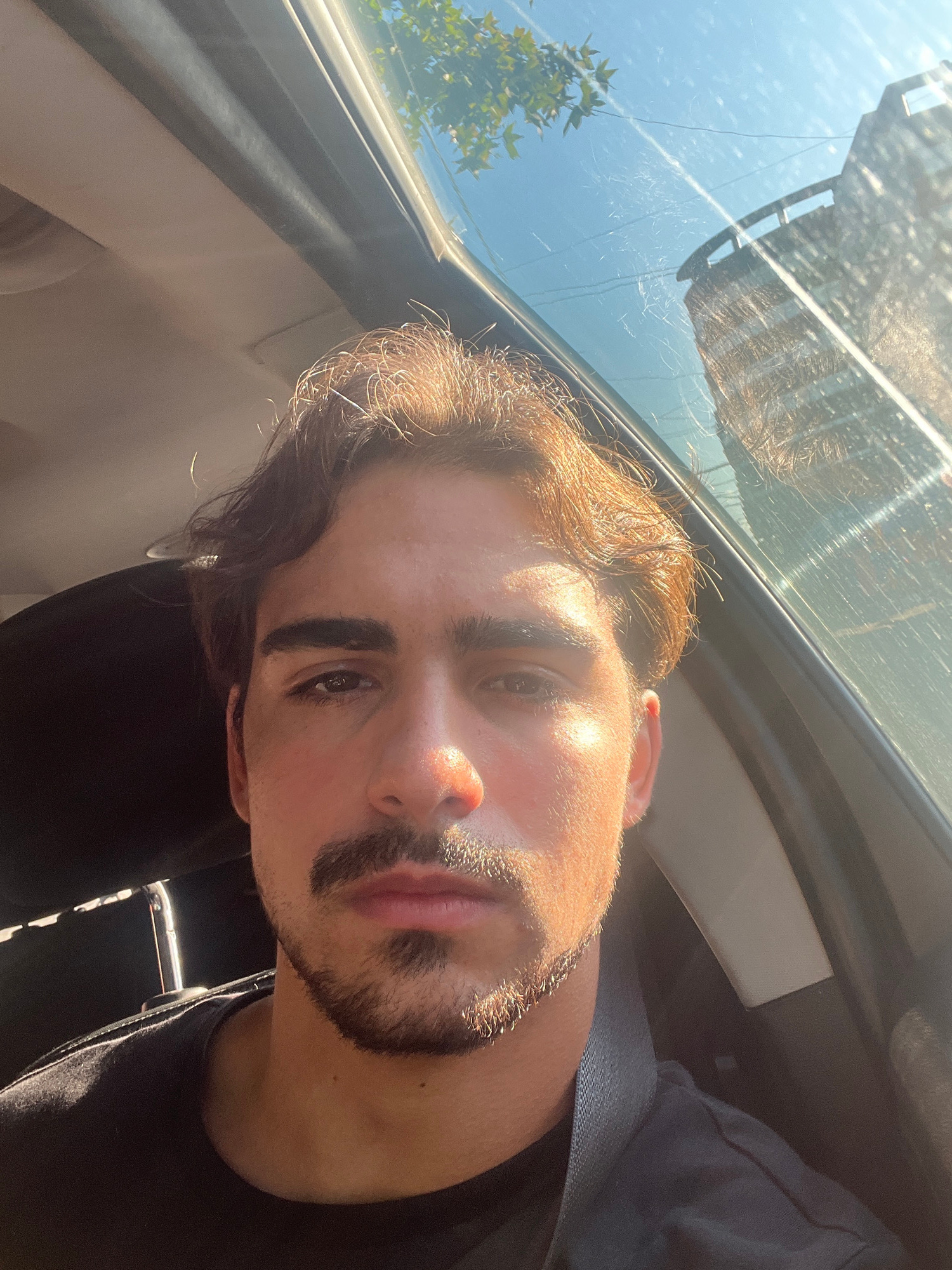 A close-up, slightly angled photograph depicts a man with brown hair, dark eyes, and a trimmed beard. He is seated inside a car, as evidenced by the seatbelt across his chest and the interior of the v…read more