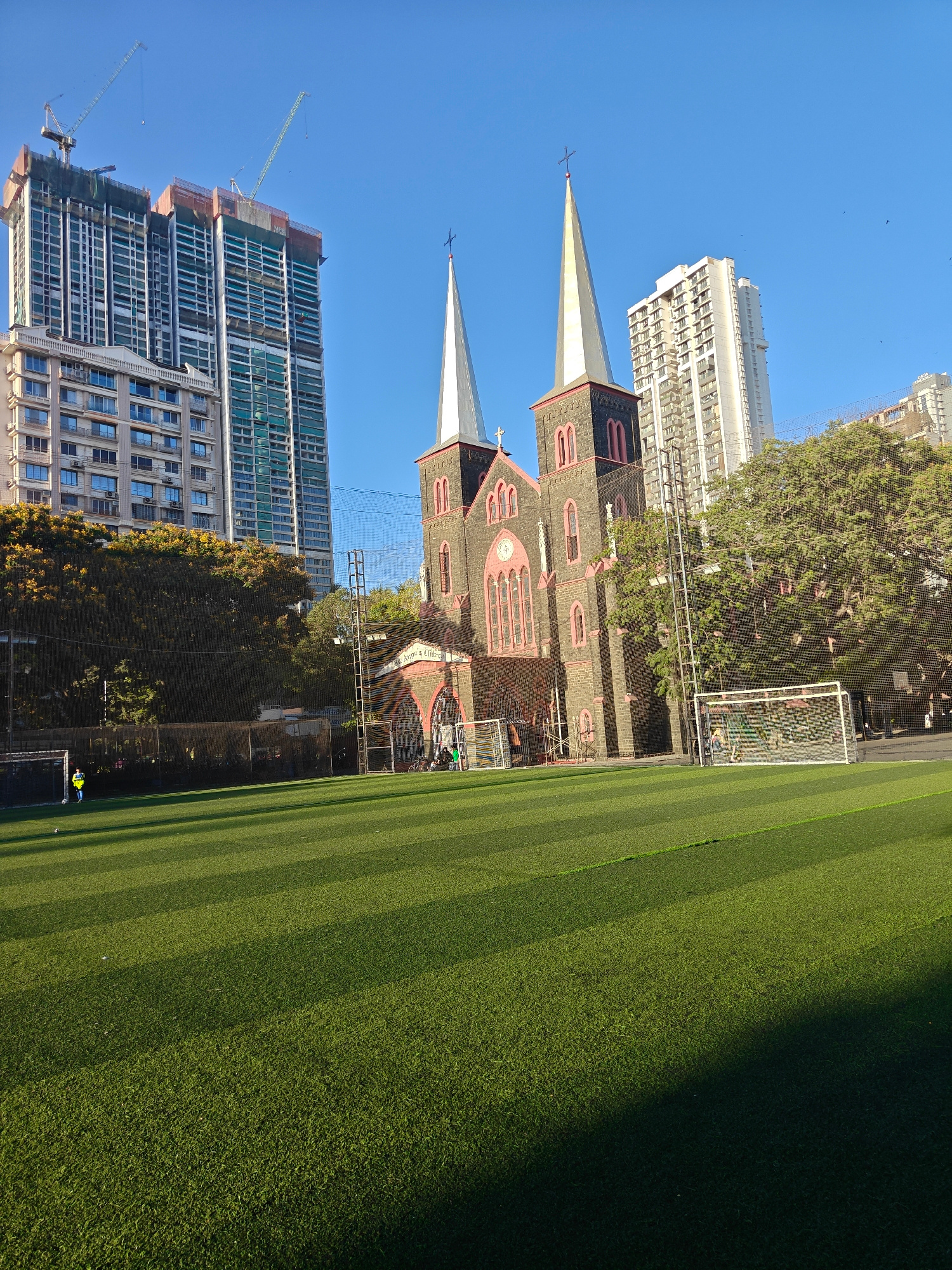 The image captures a view of St. Anne’s Church in Mumbai, India, situated adjacent to a soccer field. The church features a dark stone facade with pink accents and twin silver spires. A modern soccer…read more