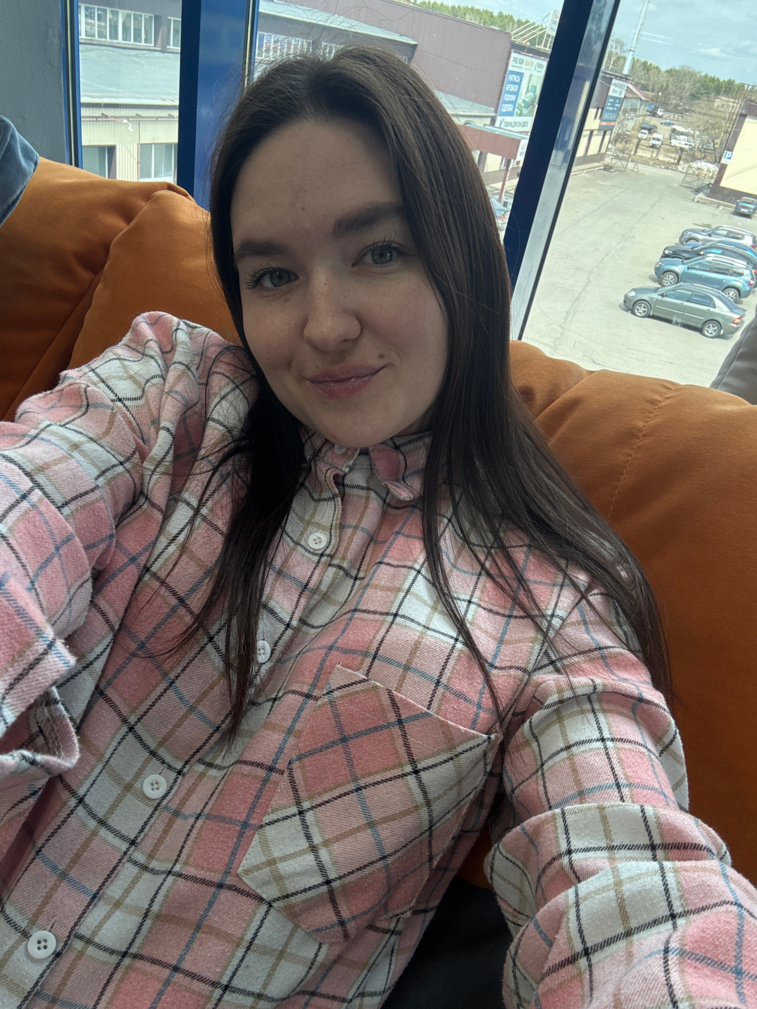 A young woman with dark hair and fair skin is taking a selfie. She is wearing a pink and white plaid shirt and appears to be sitting on an orange cushion. Through a window, a parking lot with several…read more