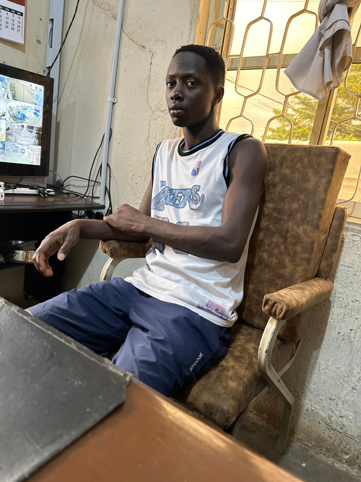 A person with dark skin is sitting in a brown armchair in what appears to be an indoor space. The person is wearing a white basketball jersey with "76ERS" visible, and navy blue Reebok shorts. The ind…read more