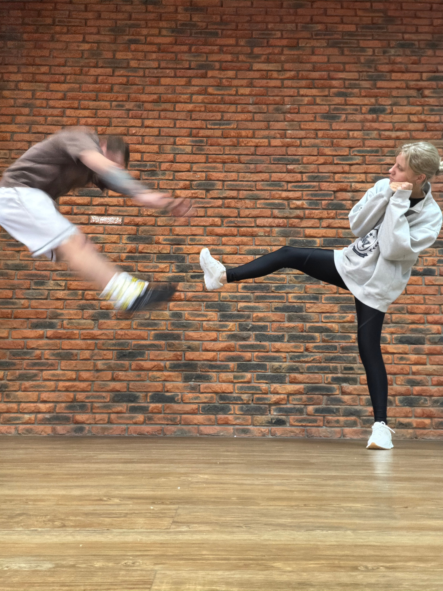 A woman with blonde hair tied in a bun, wearing a white hooded sweatshirt, black leggings, and white sneakers, is depicted in a martial arts pose. Her right leg is extended forward, and her hands are…read more