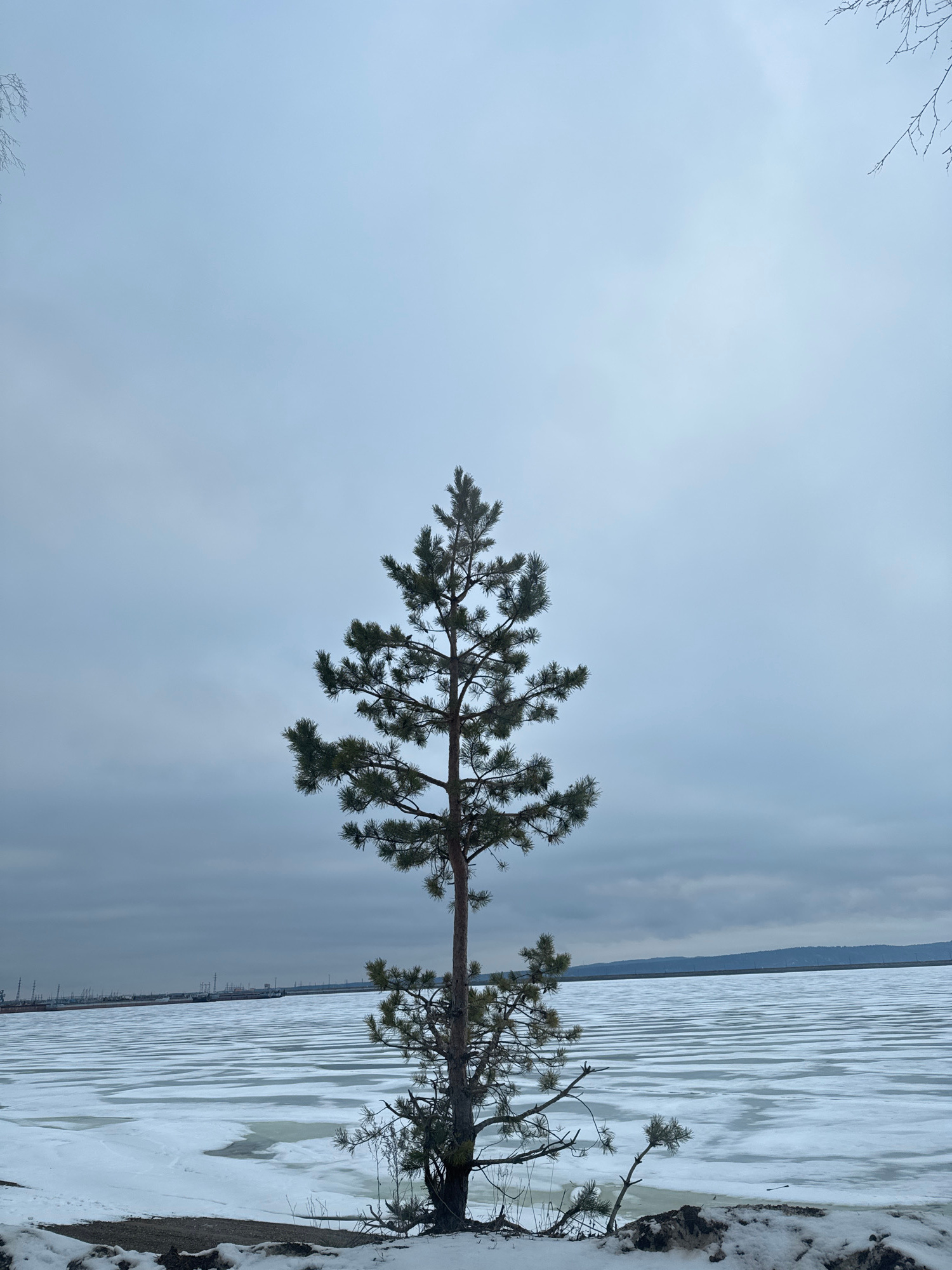 The image depicts a winter scene, likely taken in Chaikovsky, Russia, due to the presence of industrial infrastructure on the horizon. A solitary pine tree stands at the edge of a frozen body of waterβ¦read more