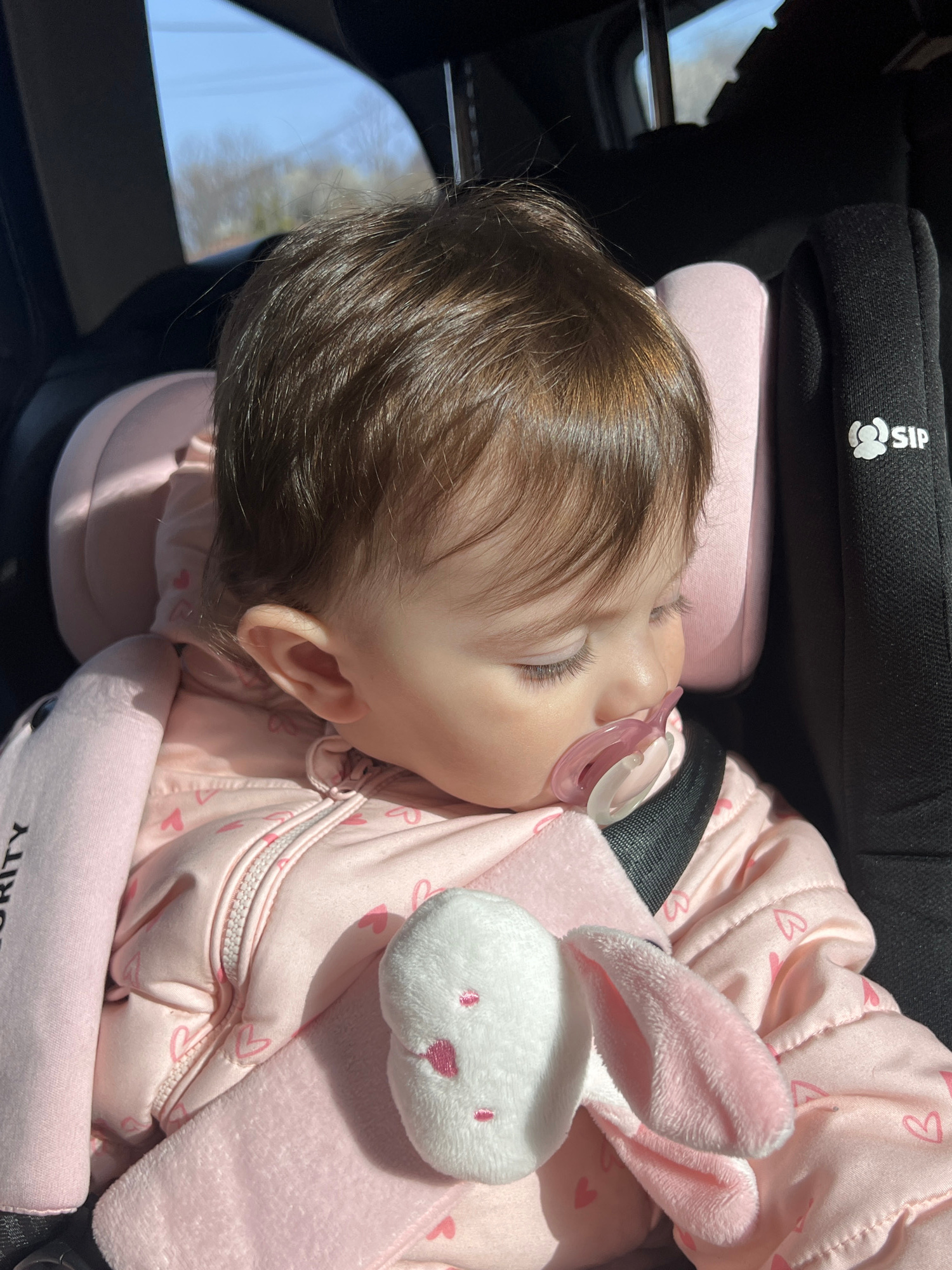 A baby is sleeping in a car seat. The baby is wearing a pink outfit with a heart pattern and has a pacifier in their mouth. A plush bunny is next to the baby. The car seat has a black headrest with "S…read more