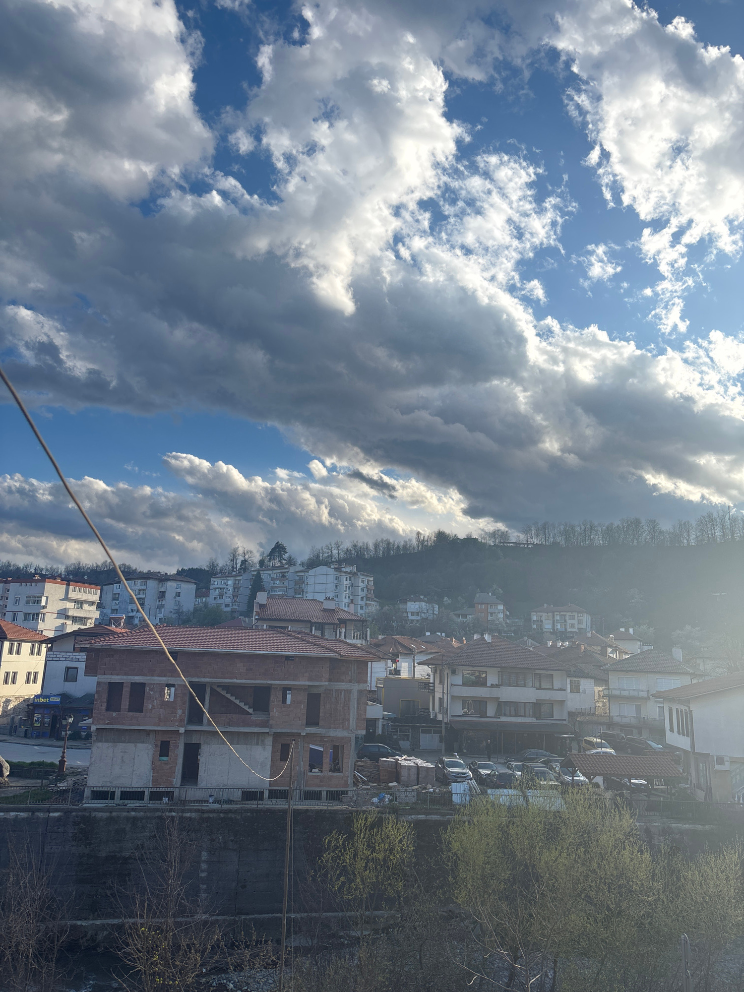 The image shows an upward-angled view of a cityscape, likely taken from a high vantage point in Zlatograd, Bulgaria. The sky dominates the left portion of the frame, exhibiting a mix of blue sky and d…read more