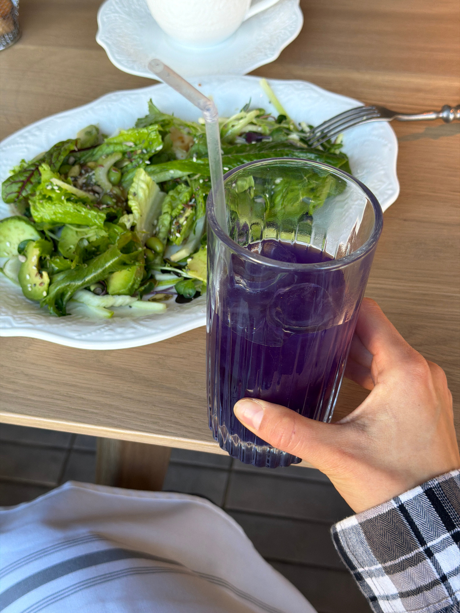 A close-up, elevated shot shows a person pouring a purple liquid from a tall glass into a white, ornate bowl of salad. The salad contains green leaves, avocado, and other ingredients. A fork is positi…read more