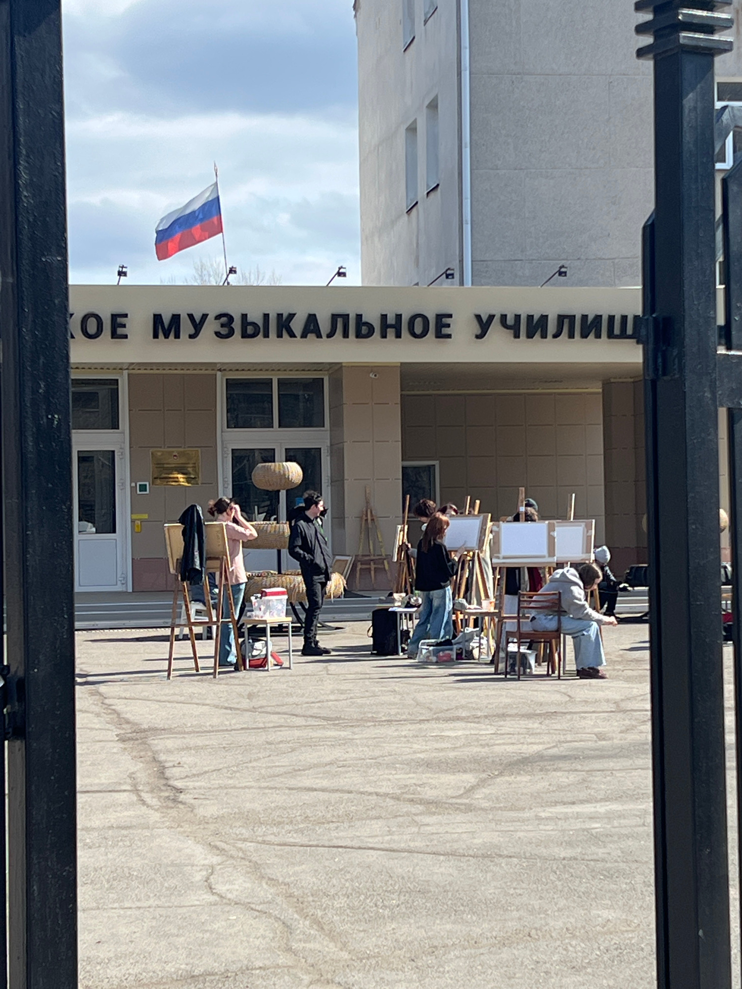The image depicts a group of people painting outdoors in front of a building. Several individuals are seated on chairs, each with an easel and canvas set up before them. It appears they are engaged in…read more