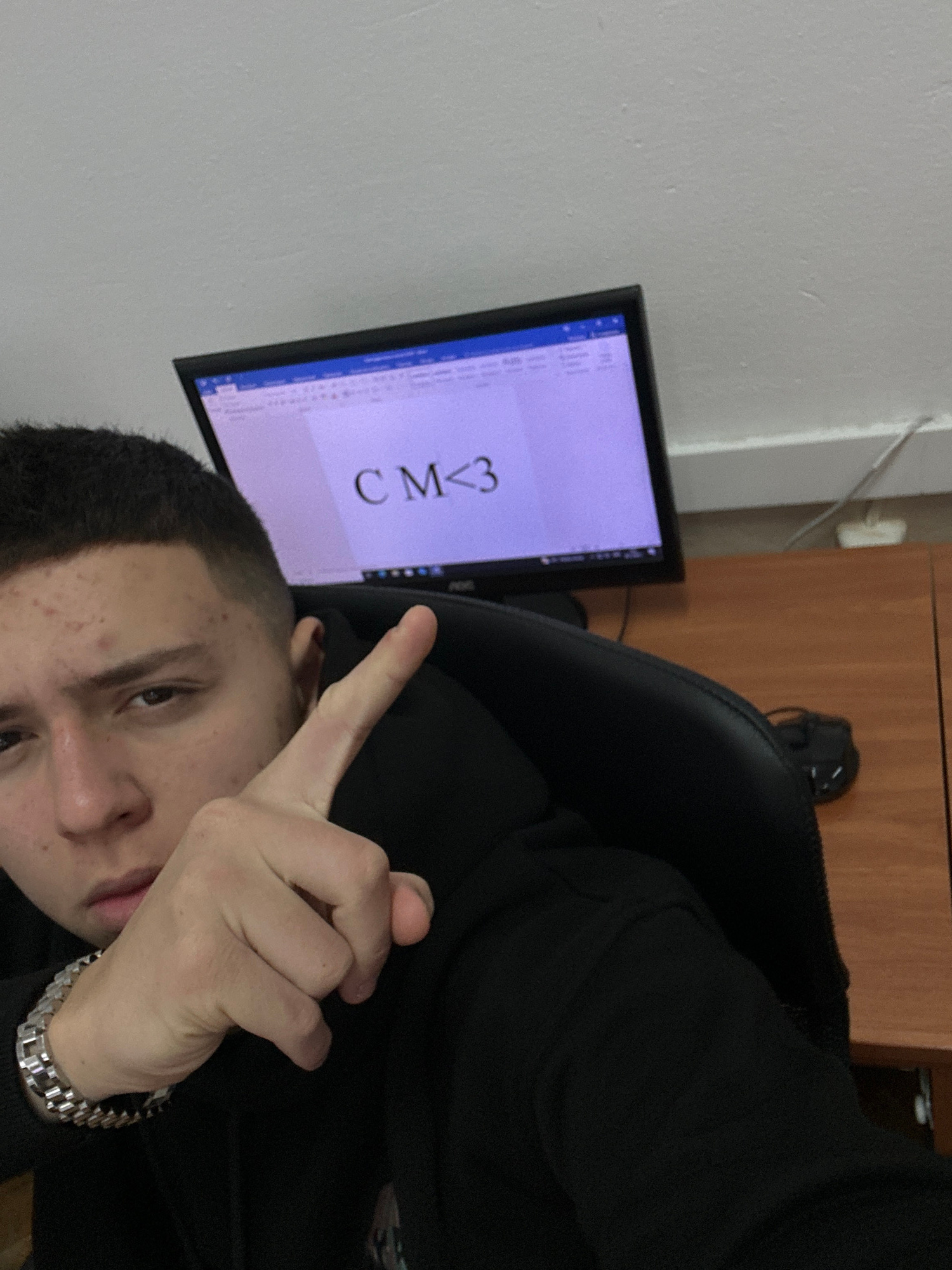 A close-up, low-angle shot features a young man positioned in a black chair in front of a computer monitor. The monitor displays the text "CM<3" in a word processing program. The man's face is partial…read more