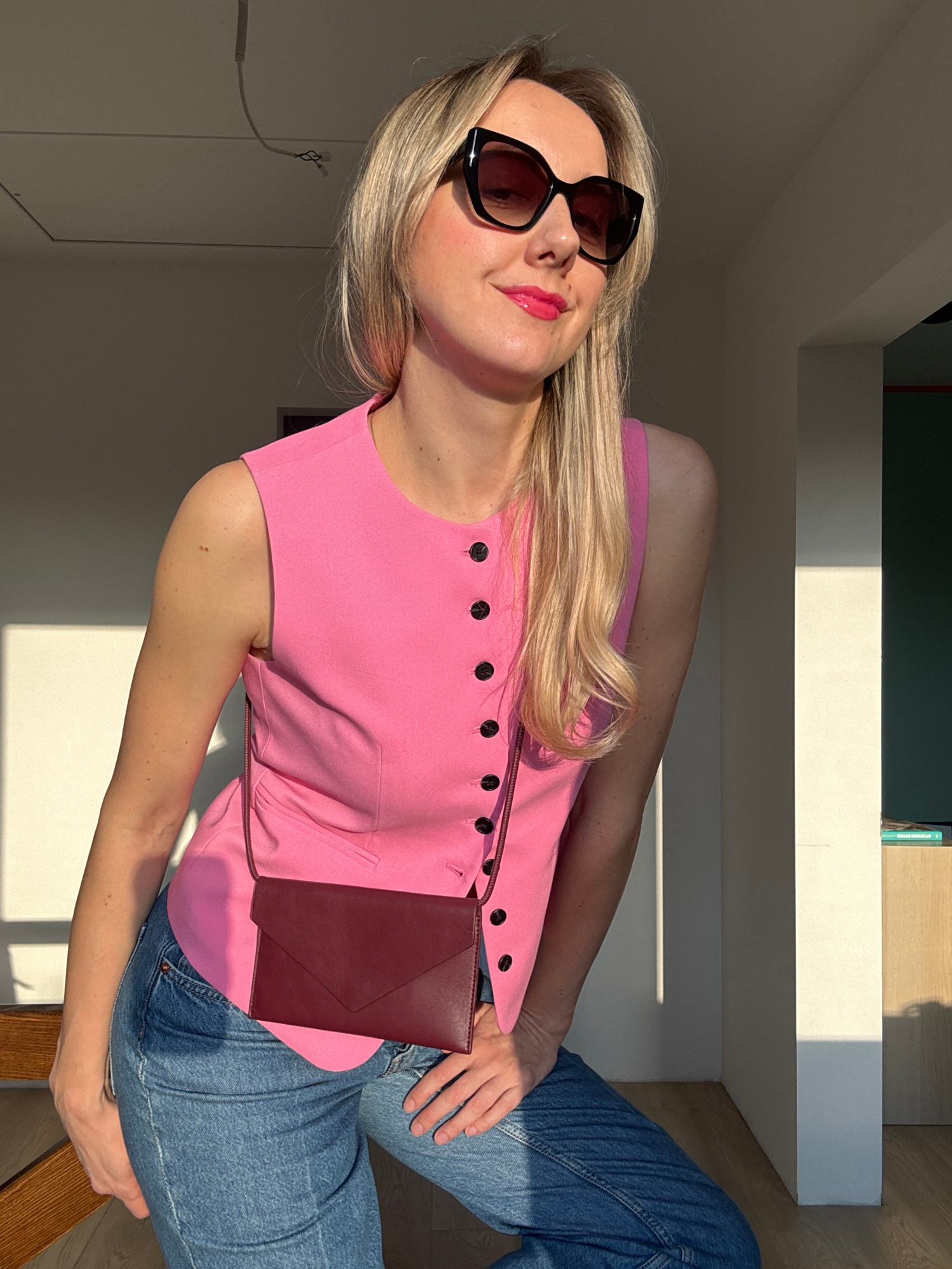 A woman is photographed indoors, positioned at an angle to the viewer and rotated counter-clockwise. She is wearing sunglasses, a pink sleeveless top with dark buttons down the front, and blue jeans.…read more