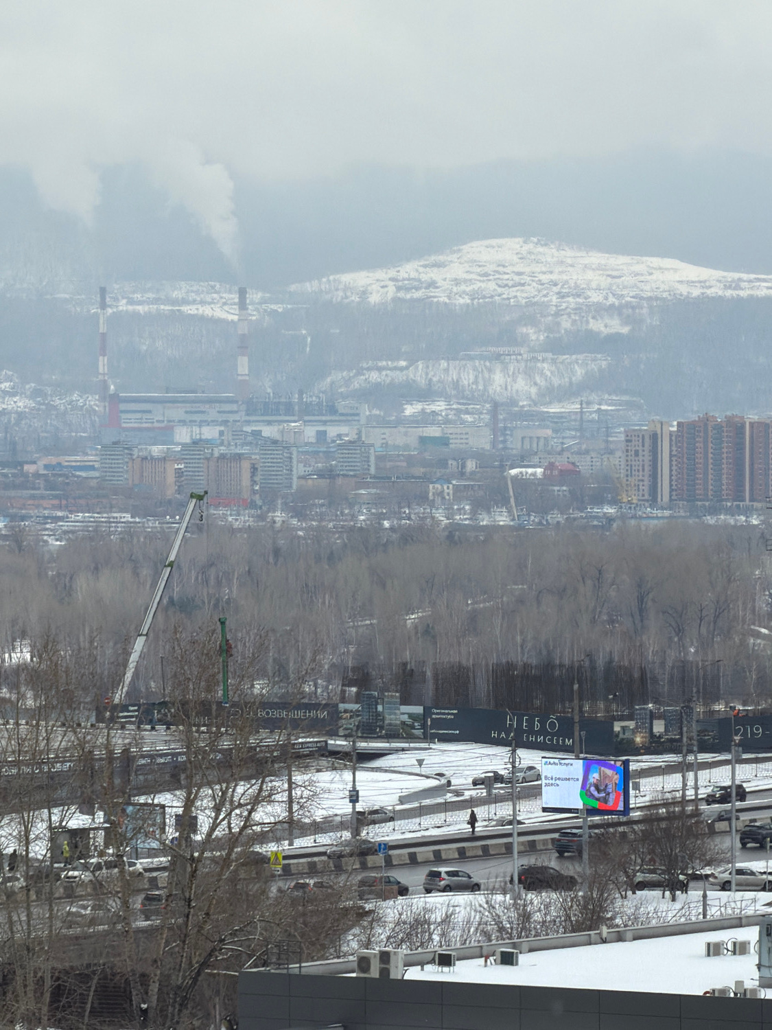 This is a panoramic view of a snow-covered city during winter, taken from an elevated perspective, likely a window in a tall building. The scene depicts a cold, overcast day with muted colors. In the…read more