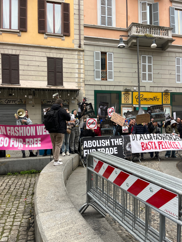 This image depicts an outdoor protest occurring on a cobblestone street in Milan, Italy, specifically targeting the fur trade and potentially Milan Fashion Week. The scene is set against a backdrop ofโฆread more