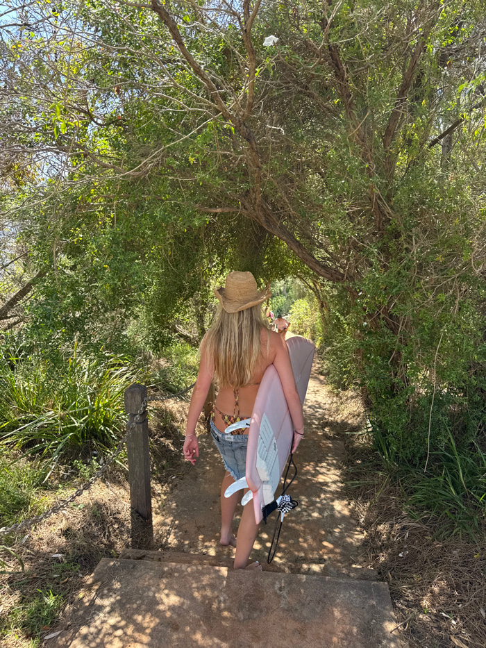 A young woman in a bikini top, denim shorts, and a straw hat walks along a path carrying a light pink surfboard. The path is surrounded by dense green vegetation, including trees and bushes. The woman…read more