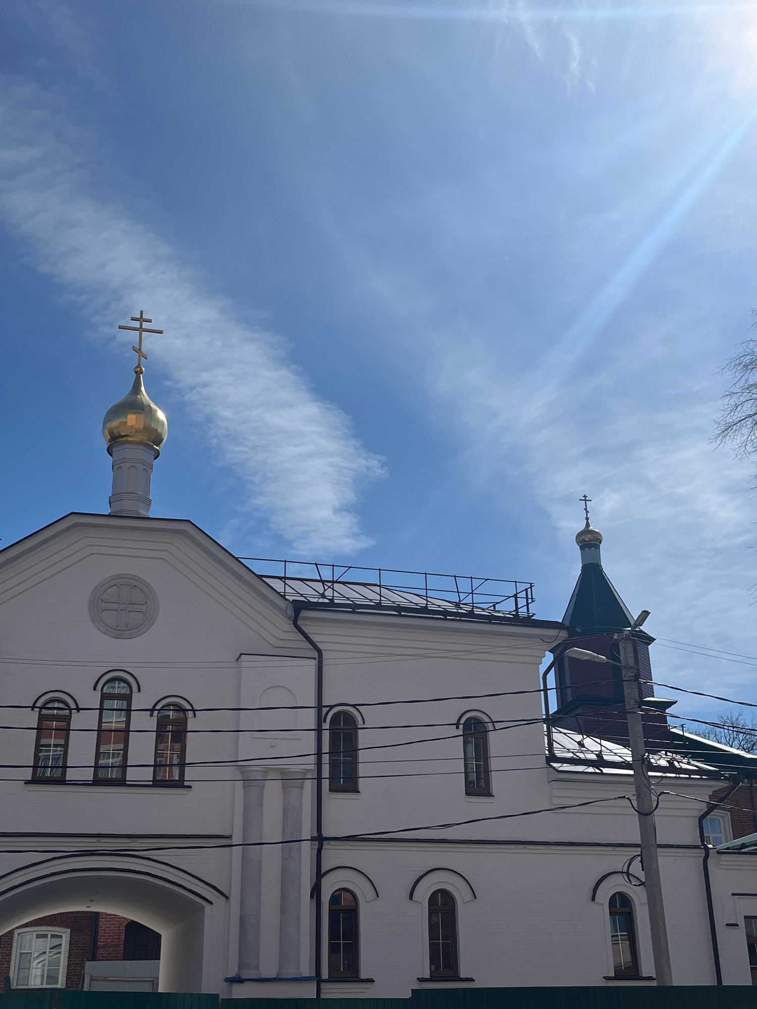 This is an outdoor, daytime photograph of an Eastern Orthodox church or chapel, likely located in Ulyanovsk, Russia, given the context. The image is composed from a low angle, looking upwards towards…read more
