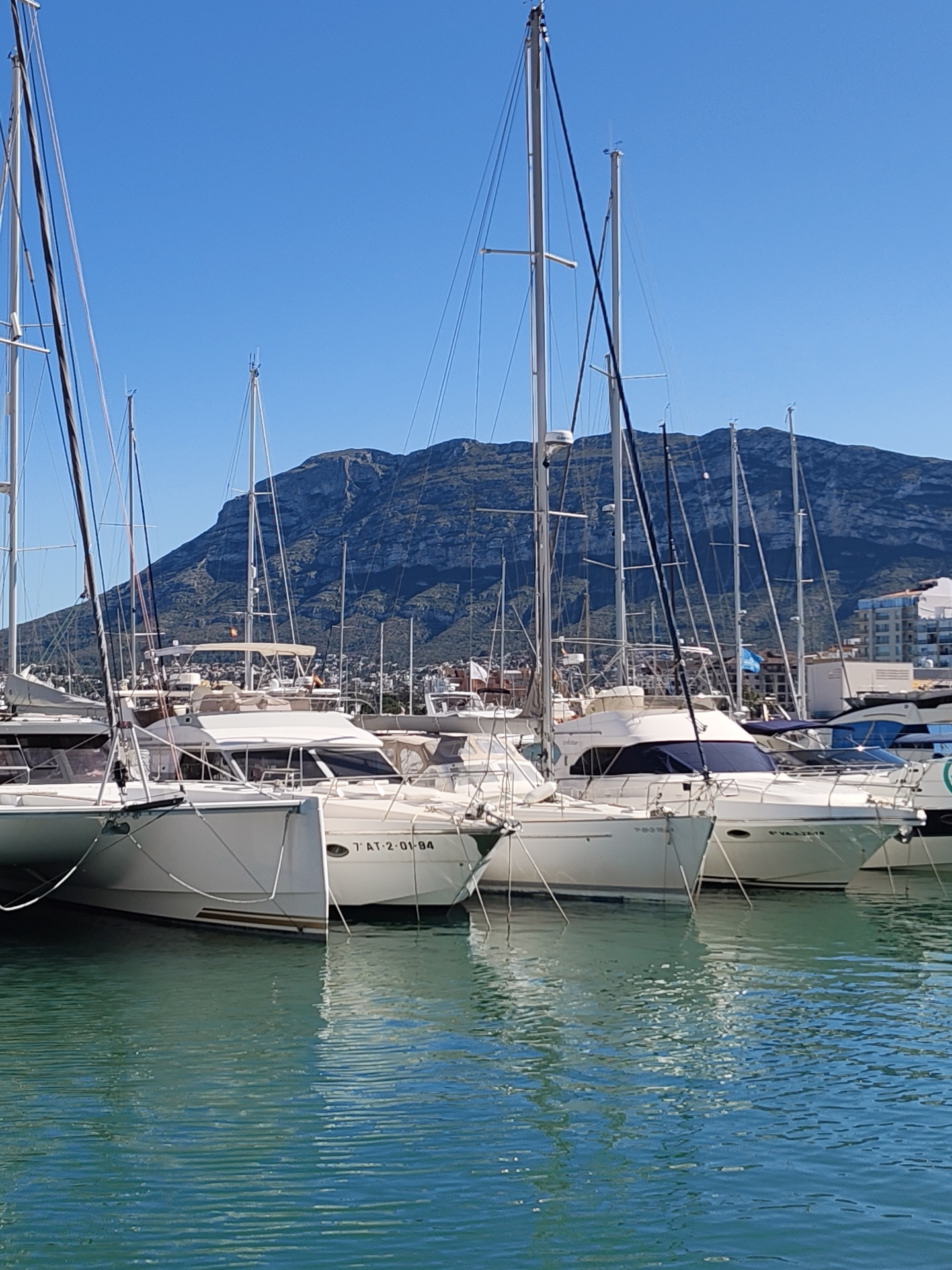 The image depicts a marina in Dénia, Spain, with a row of several white yachts moored in the water. The yachts have tall masts extending upwards, partially obscuring a large mountain in the background…read more