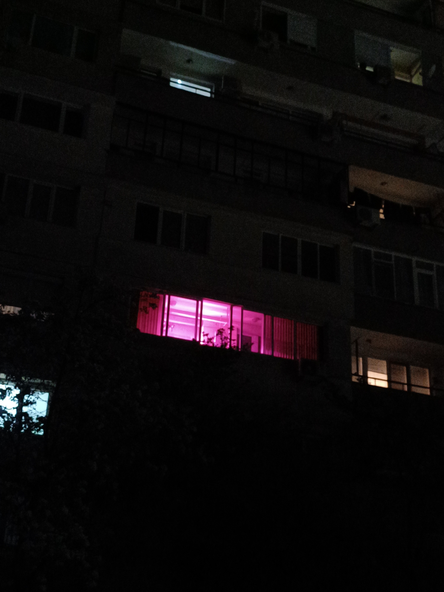 The image depicts the exterior of a multi-story building at night. The building has multiple rows of windows, some dark, and others illuminated. One specific window is brightly lit with a pink or mage…read more