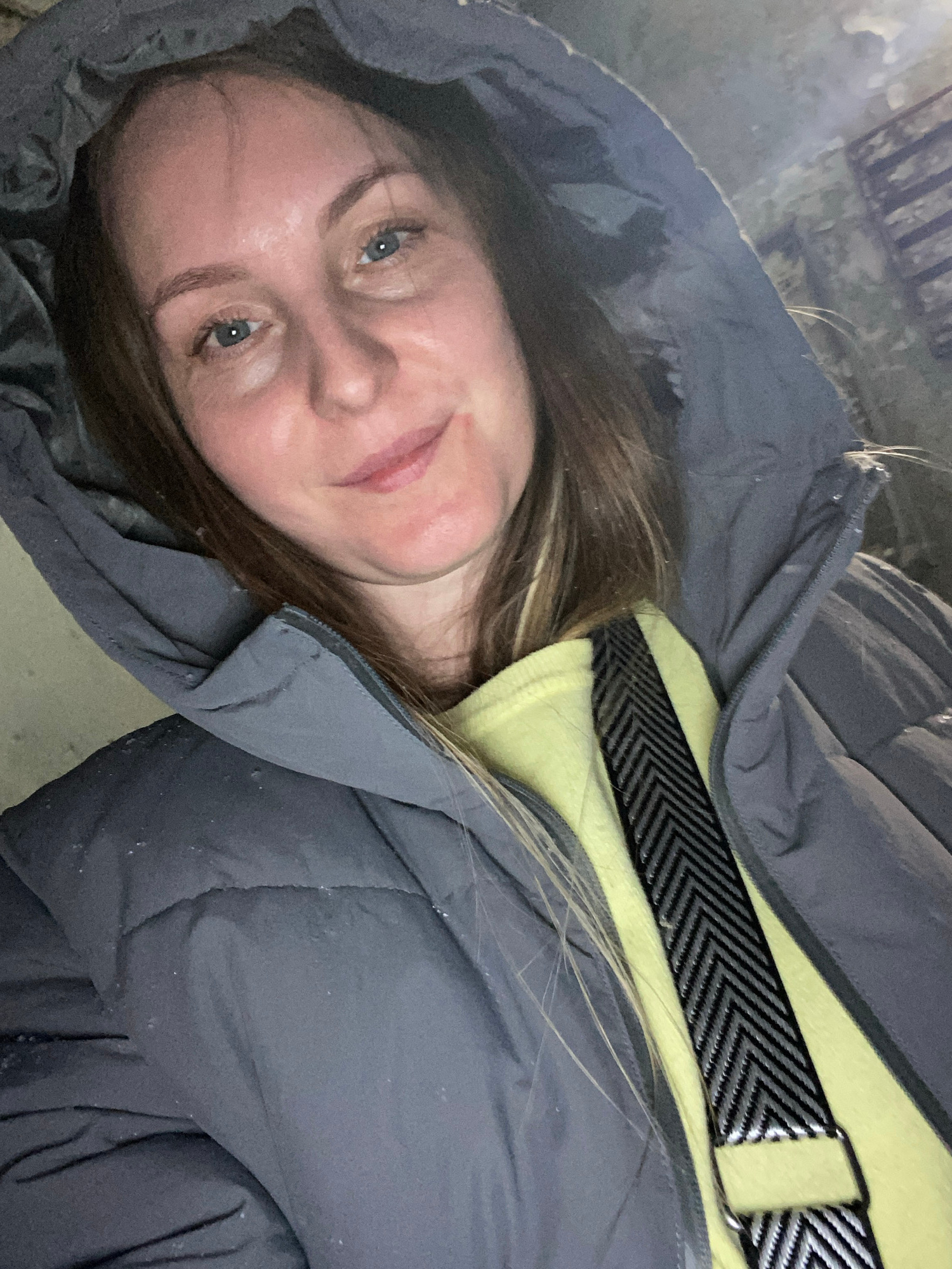 A woman with fair skin, light brown hair, and blue eyes is looking at the camera. She is wearing a gray puffy coat with the hood up and a yellow top with a black and white chevron-patterned strap acro…read more
