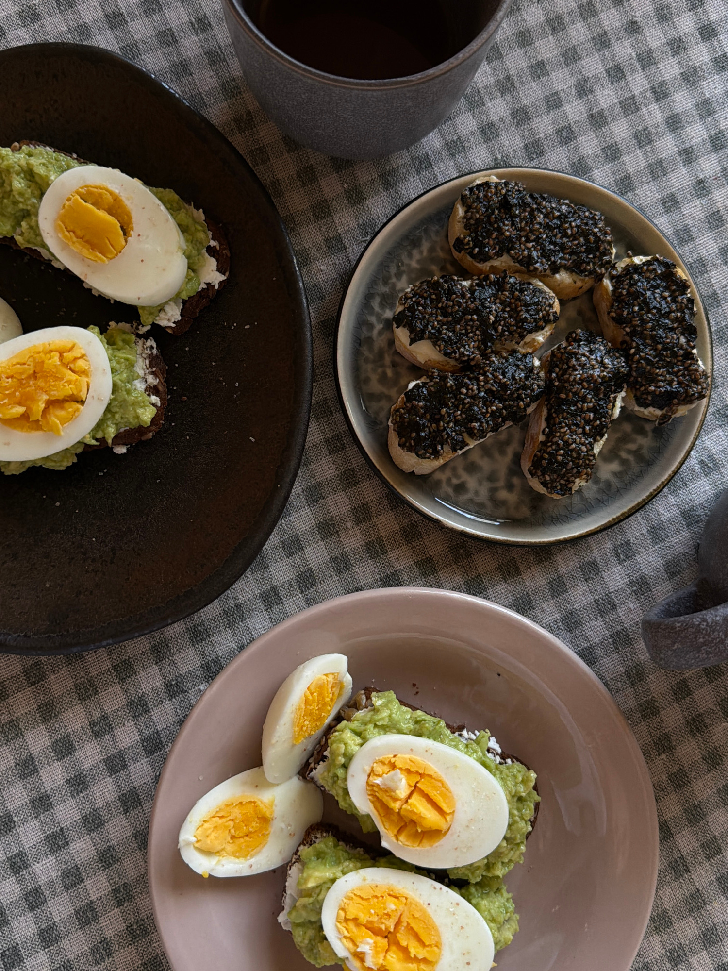 The scene presents a meal of open-faced sandwiches on a checkered tablecloth. In the upper left, a plate contains small bread slices covered in a dark, granular spread, possibly black sesame seeds. A…read more