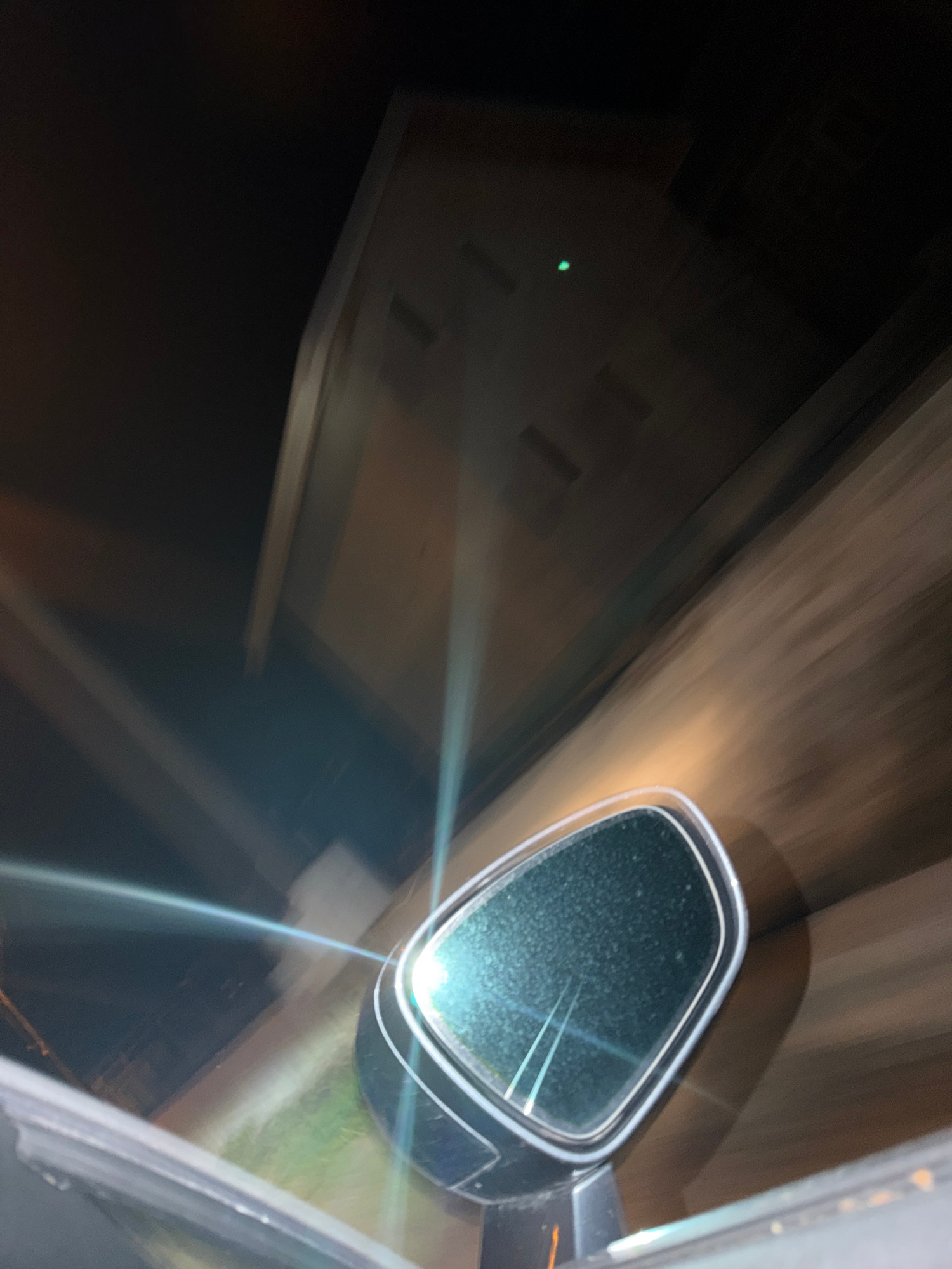 A driver's side mirror of a vehicle is angled in view, showing a reflection of a structure or building, partially obscured by motion blur. The environment appears to be dimly lit, likely at night. The…read more