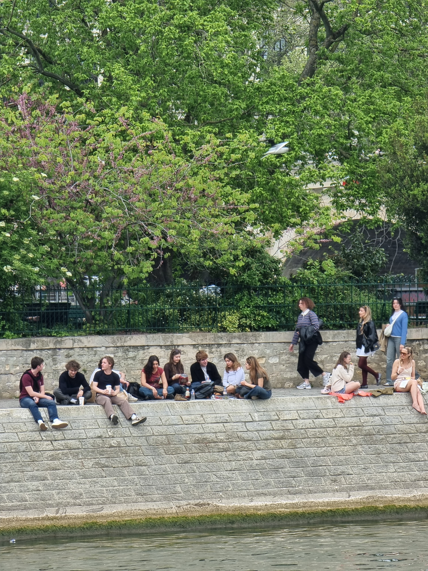 This image depicts a lively daytime scene along a stone embankment beside a body of water, likely the Seine river in Paris, given the provided context. The primary subjects are a group of people, mos…read more