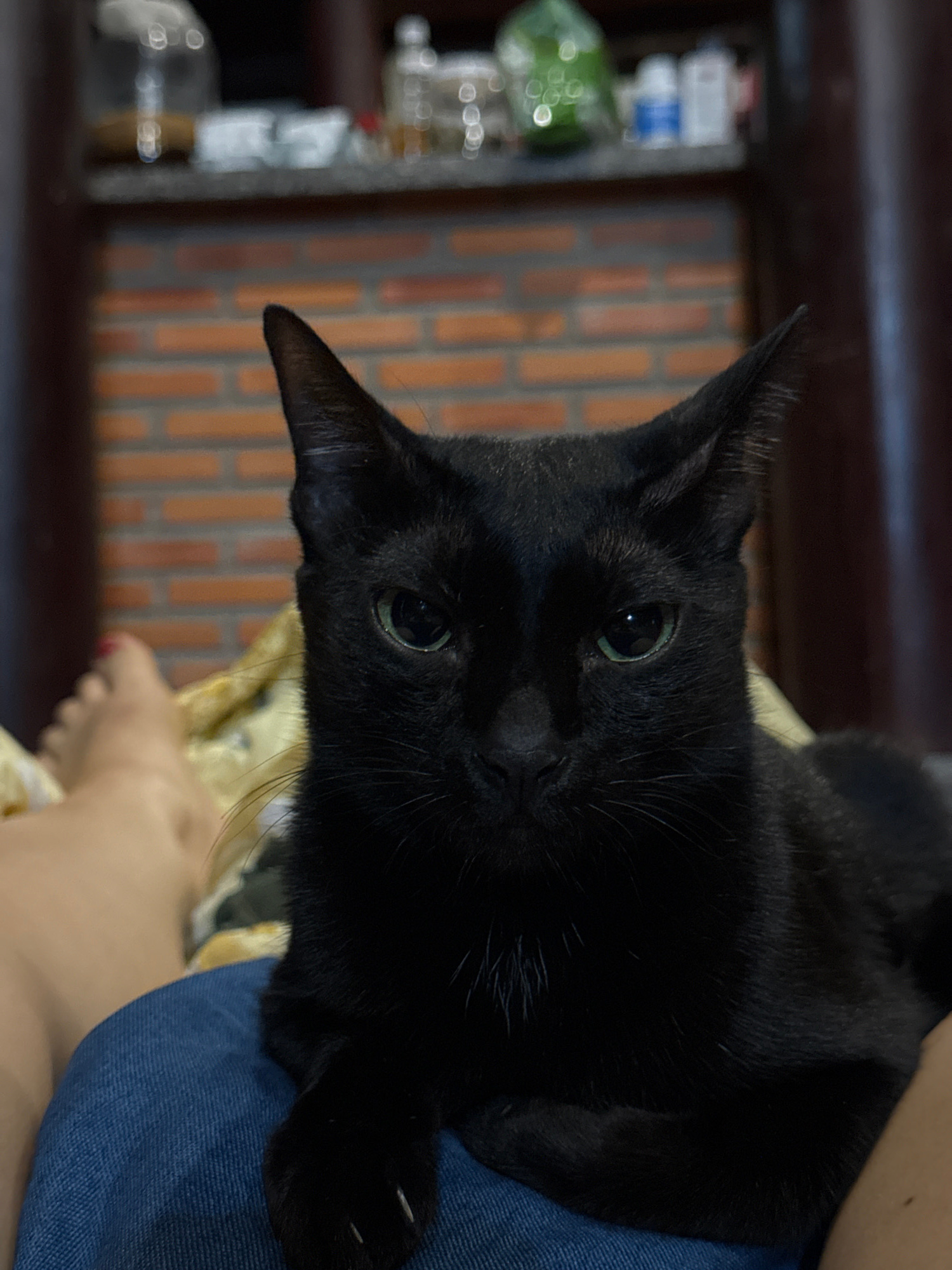 A close-up shot of a black cat with pointed ears, perched in someone's lap. The cat has green eyes and its fur appears glossy. The lap is covered with blue denim material. In the background, there is…read more