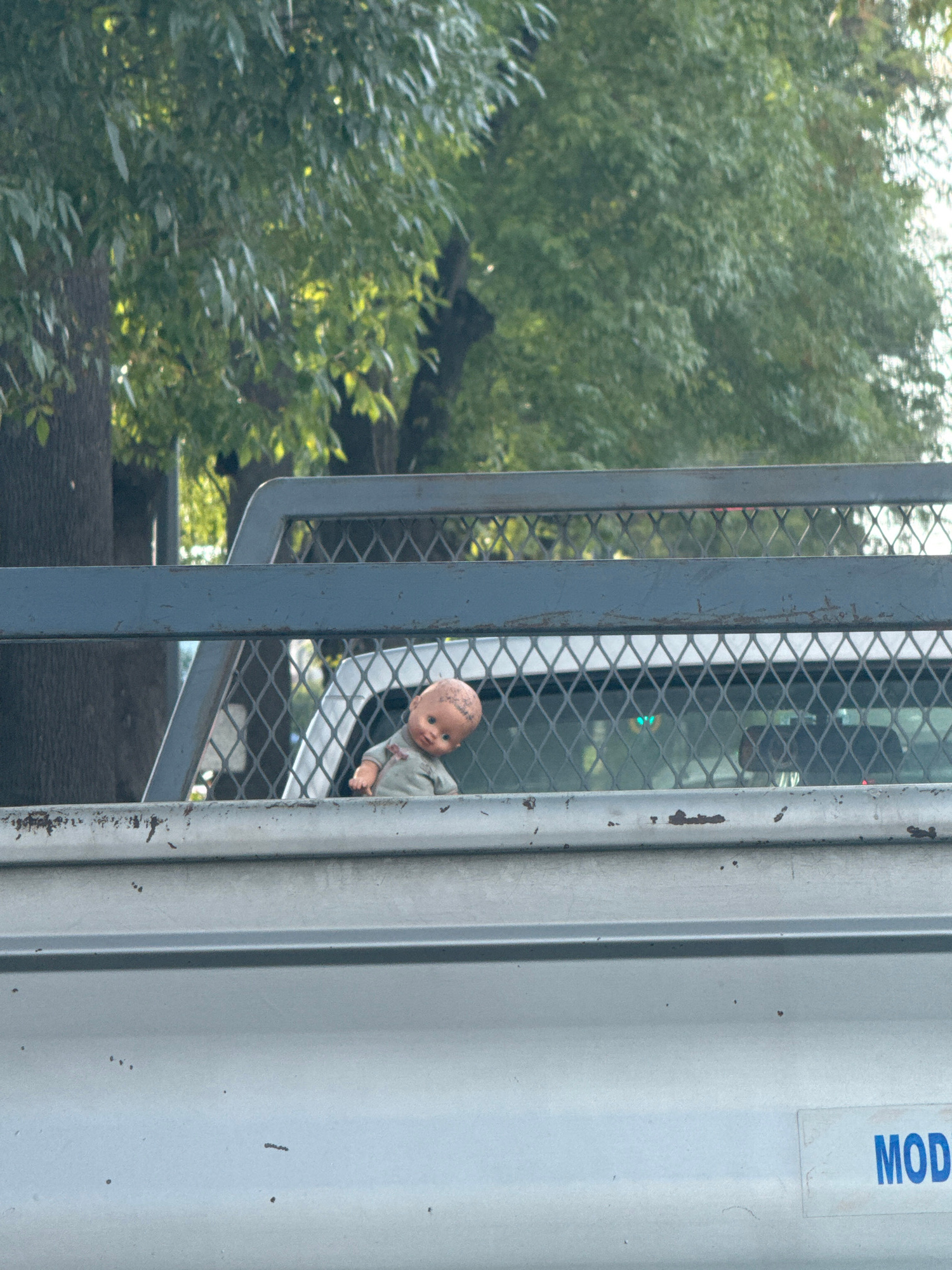 The image shows a doll looking out from behind a metal grate on the side of a truck. The truck is silver with a vertical seam along the side. A sign reading "MOD" is partially visible at the top. The…read more