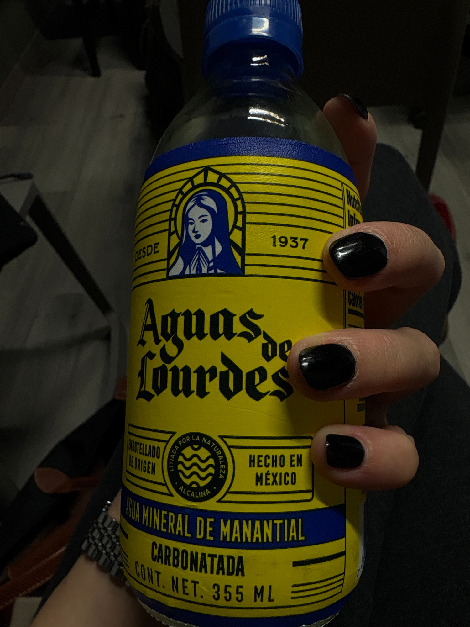 A human hand with polished black fingernails is gripping a bottle of Aguas de Lourdes mineral water. The bottle is yellow with blue trim and a blue cap. The label reads "Aguas de Lourdes" in black let…read more