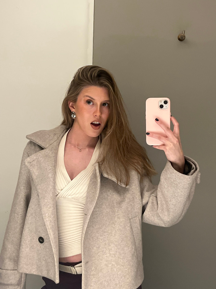 A woman takes a selfie. She wears a beige coat over a cream-colored top, her long light-brown hair falling past her shoulders. She holds a pink iPhone to capture the image, her nails painted black. Th…read more