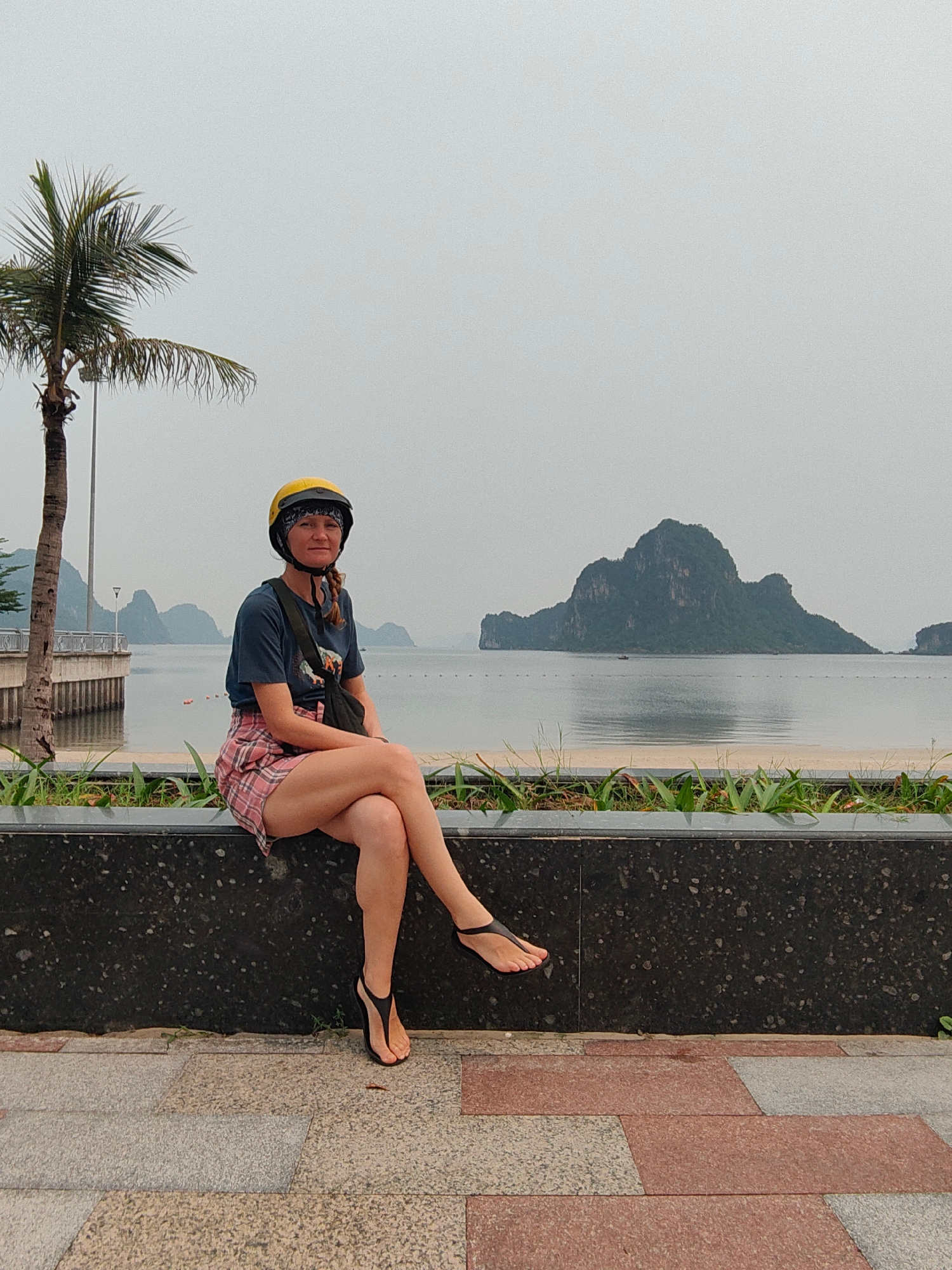 A woman is depicted sitting on a low, dark, speckled stone wall, looking directly at the camera with a neutral expression. She wears a yellow scooter helmet, a dark blue short-sleeved t-shirt, a pink…read more