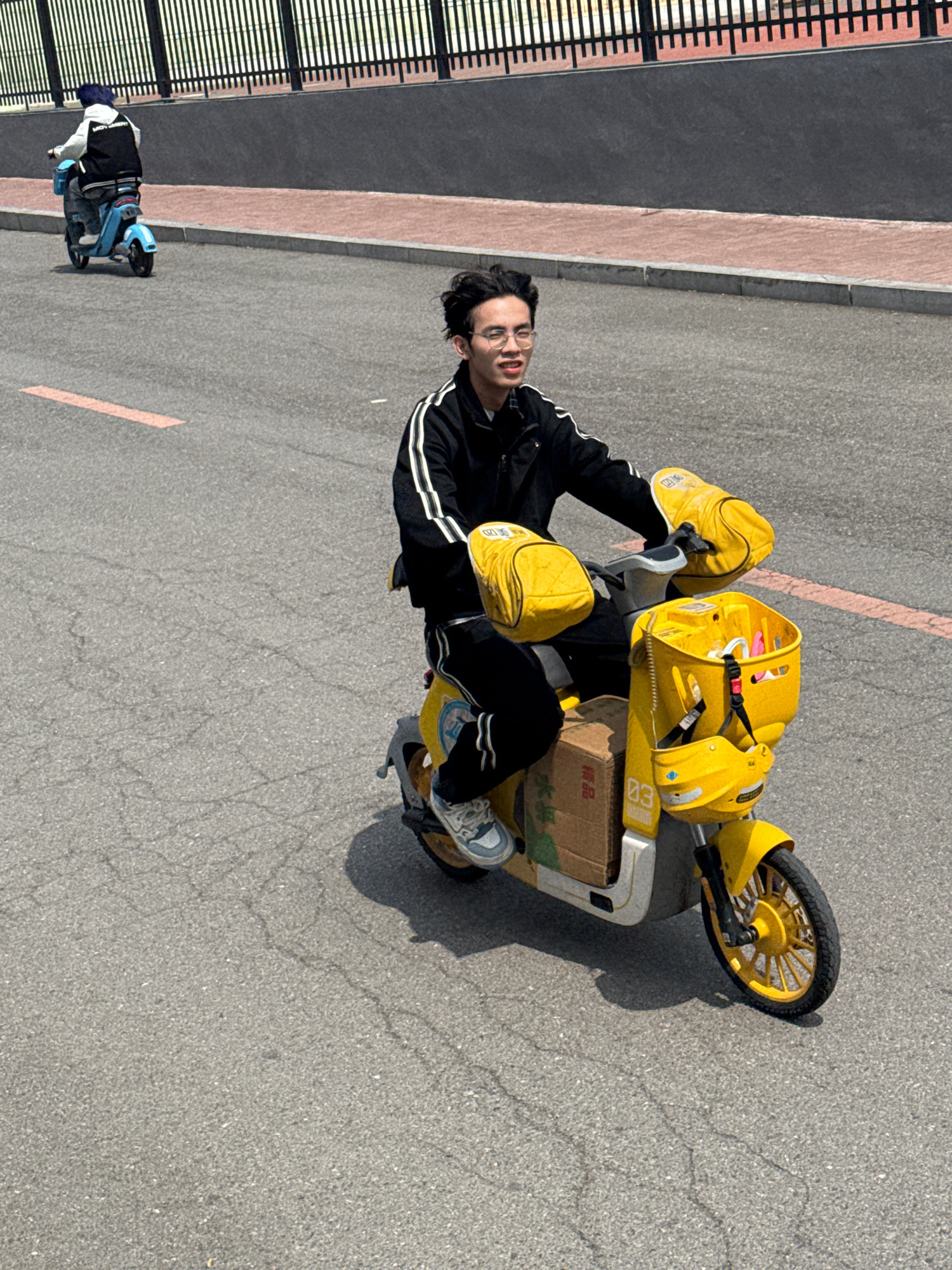 The image, oriented vertically, captures a bright outdoor scene with a young man on a yellow electric scooter. The man, positioned centrally, looks directly at the camera with a slight smile. He has d…read more