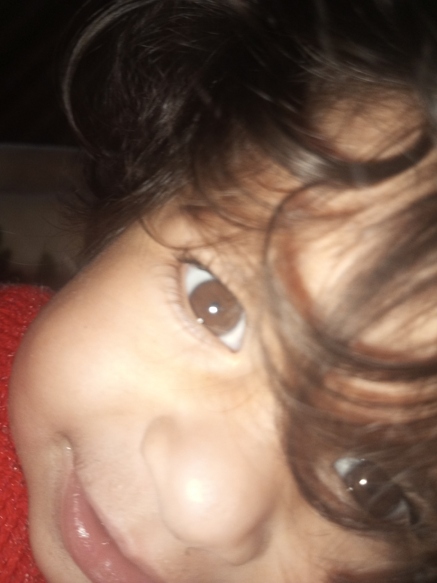 A close-up portrait shows a child with brown eyes and curly brown hair. Part of a red garment is visible on the left. The location is unspecified and cannot be determined from the image. The image con…read more