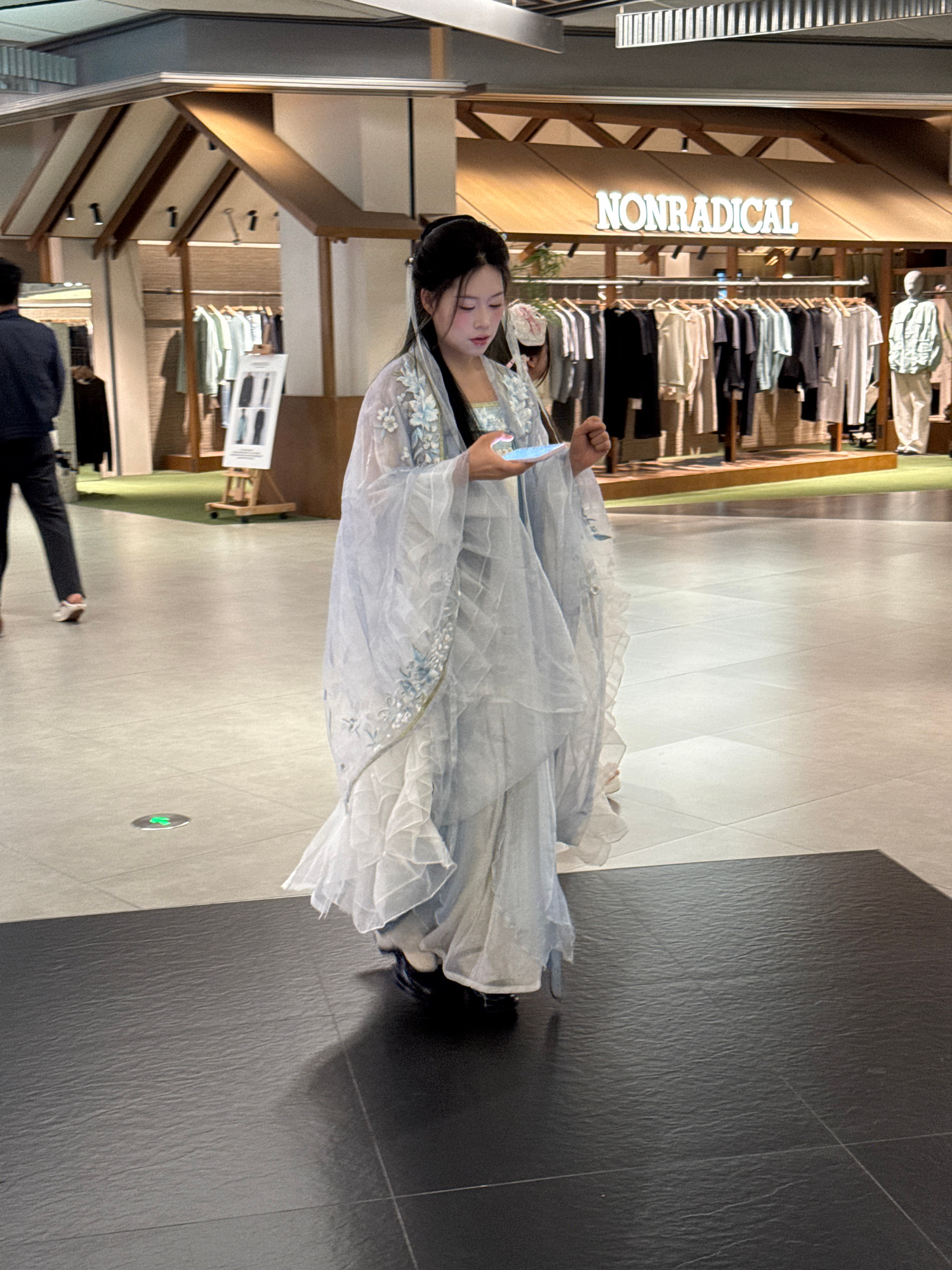 In a brightly lit commercial space, a woman dressed in a flowing, light blue and white hanfu stands holding a smartphone, seemingly interacting with it. The location is likely a shopping mall given th…read more