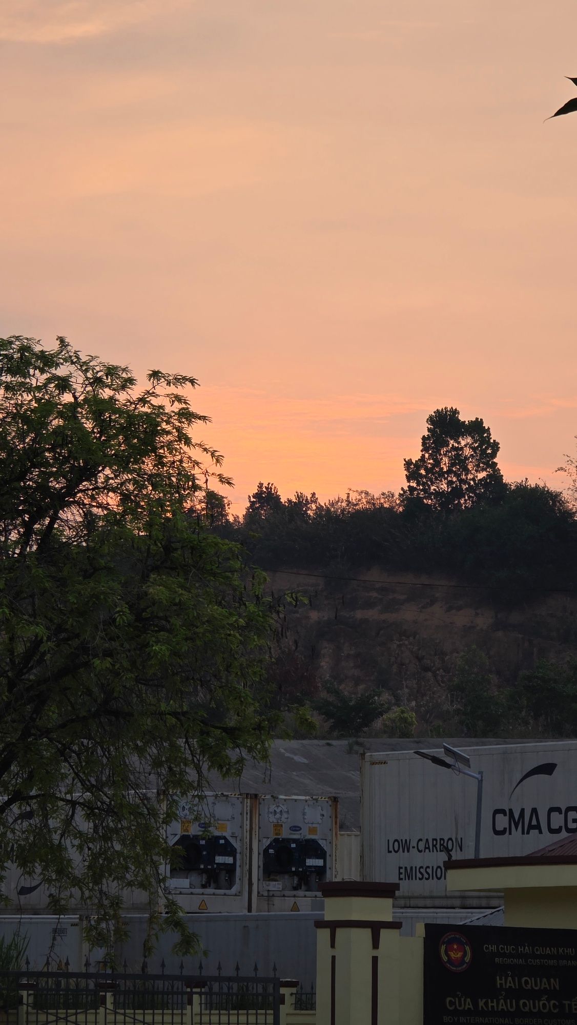 The image shows a landscape at sunset in Bờ Y, Vietnam. The sky is a mix of orange and pink. Trees are visible in the foreground. Further back, there is a building, possibly a customs office. Shipping…read more