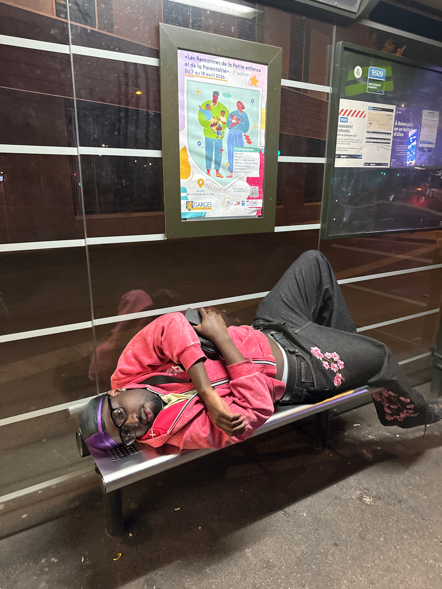 A Black person lies on a bench at a bus stop in Garges-lès-Gonesse, France. The person, wearing a red jacket, jeans with floral embroidery, and glasses, is holding a phone. A poster is on the wall of…read more