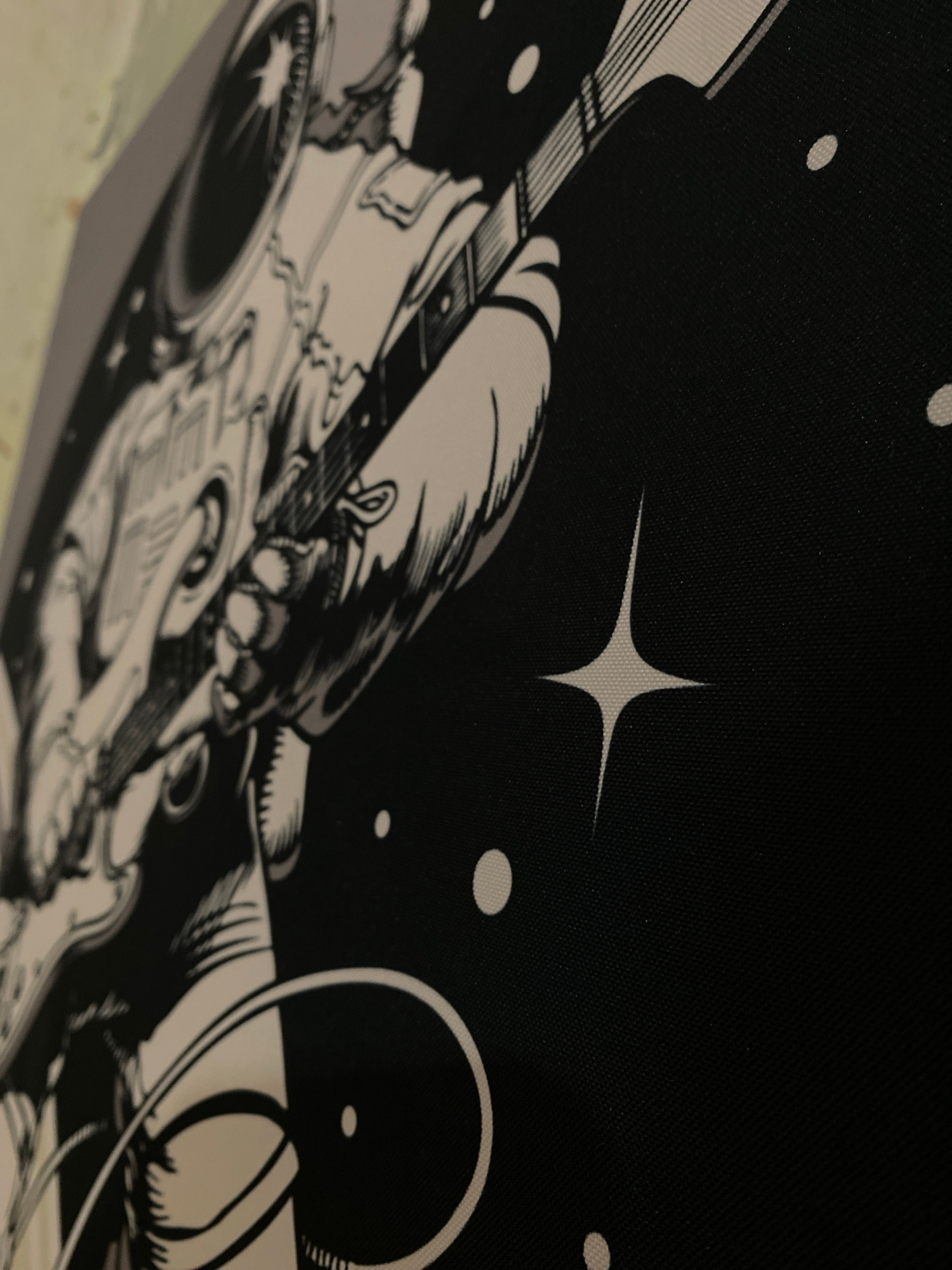 The image is a close-up of a black and white drawing. The drawing depicts a cartoon astronaut wearing a spacesuit, playing an electric guitar. The background is black with white dots and a star. The i…read more