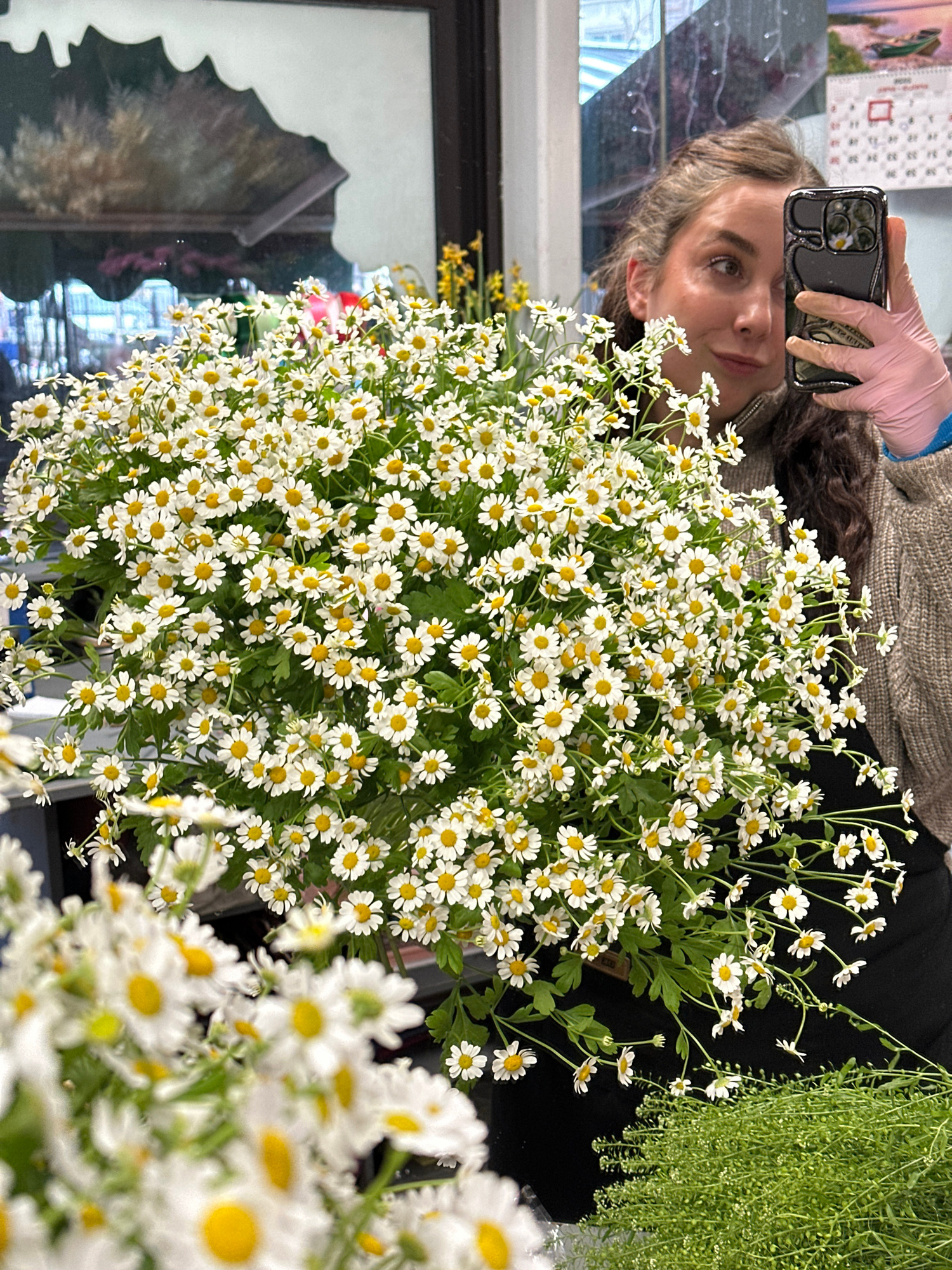A woman in a grey sweater and pink gloves is taking a selfie with an iPhone in a reflection. She is holding a large bouquet of small white daisies with yellow centers. Behind her and to the right is a…read more