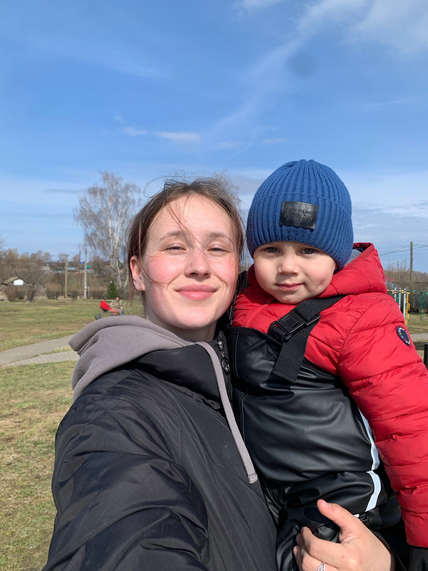 A woman is holding a young child outdoors. The child wears a blue knit cap and a red puffer jacket. The woman wears a black jacket with a gray hood. In the background, there's a grassy area, bare tree…read more