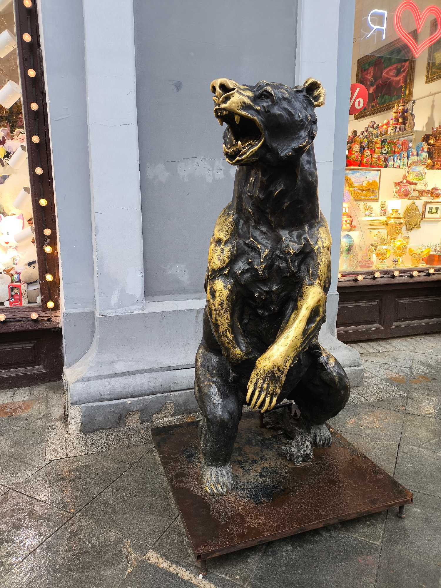 A bronze and gold bear statue sits on a rusty brown metal platform in front of two store windows on a wet, tiled city street. The bear is in a seated posture, appearing to roar with its mouth open. Th…read more