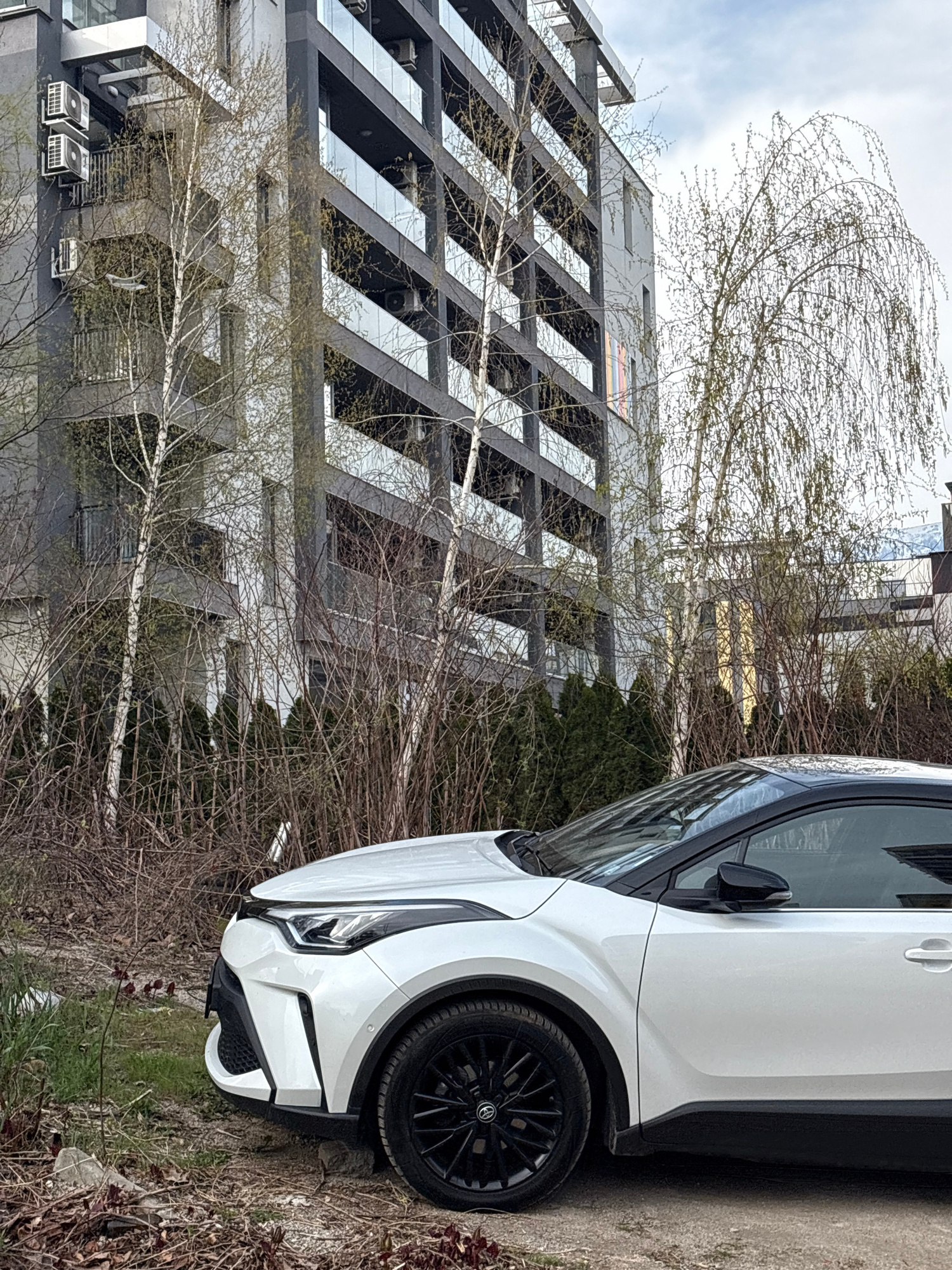 The image depicts a white car parked on a paved surface in an urban environment. The car's front passenger side is prominently featured, showcasing a black wheel. A modern building with multiple stori…read more