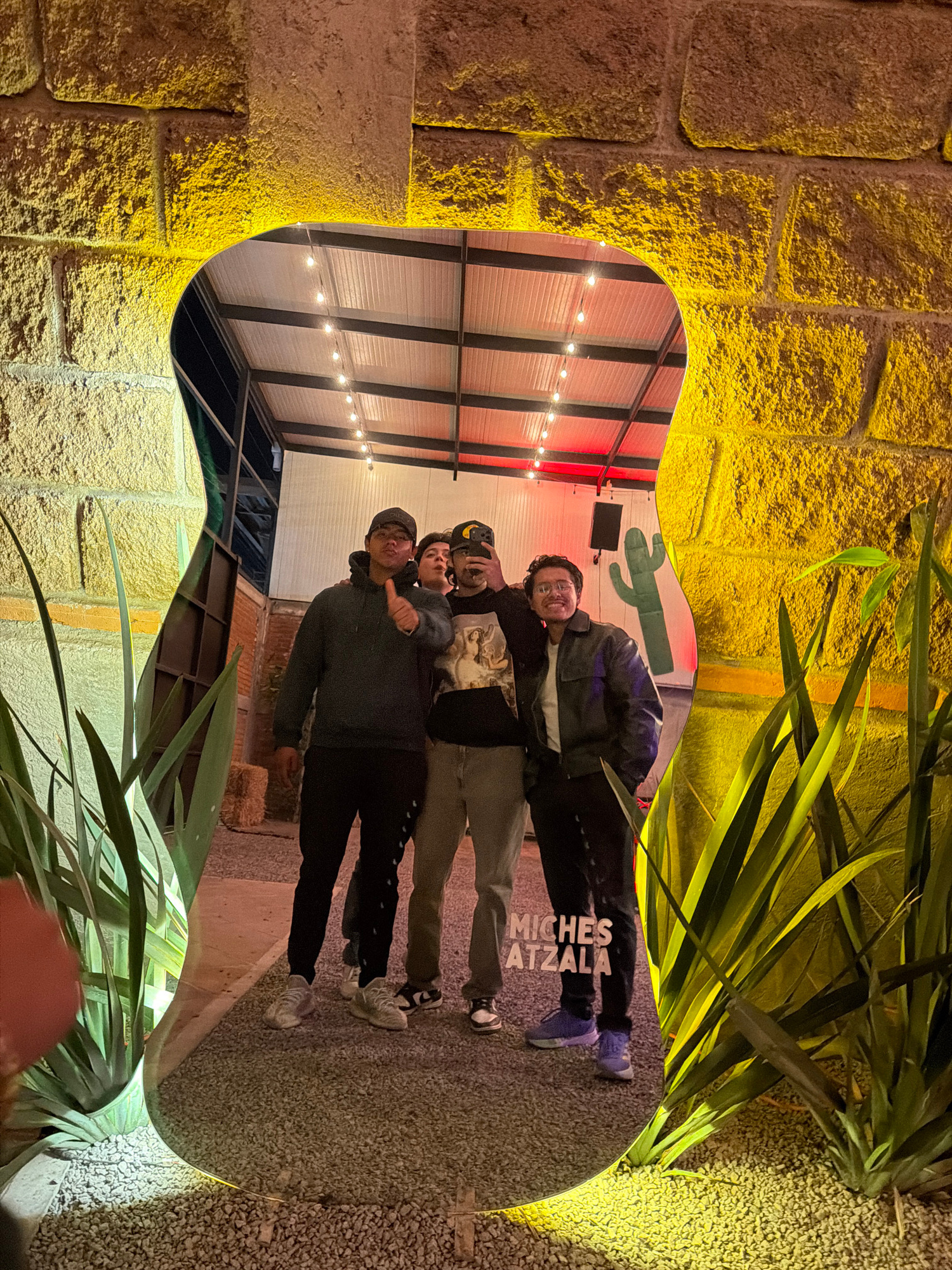 The image captures five young men posing for a photograph at night, in an outdoor or semi-outdoor setting in San Andrés Cholula, Mexico. The central and most prominent feature is a large, unique guita…read more